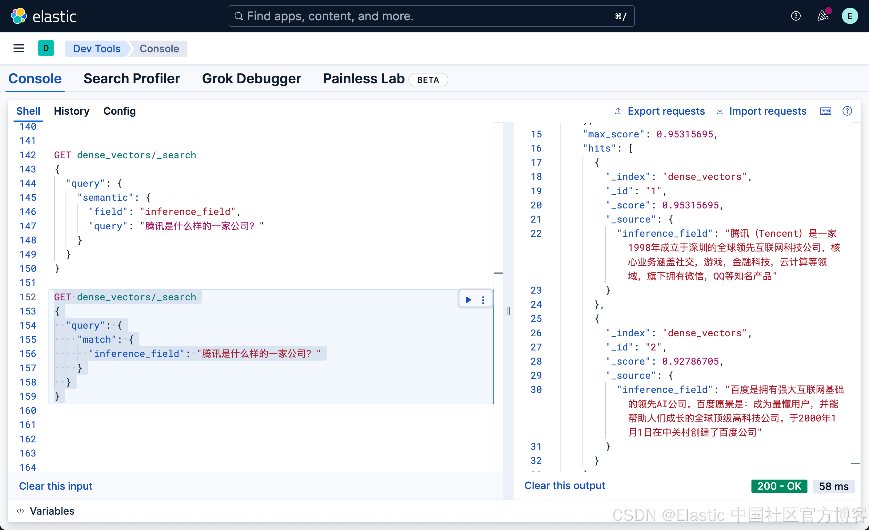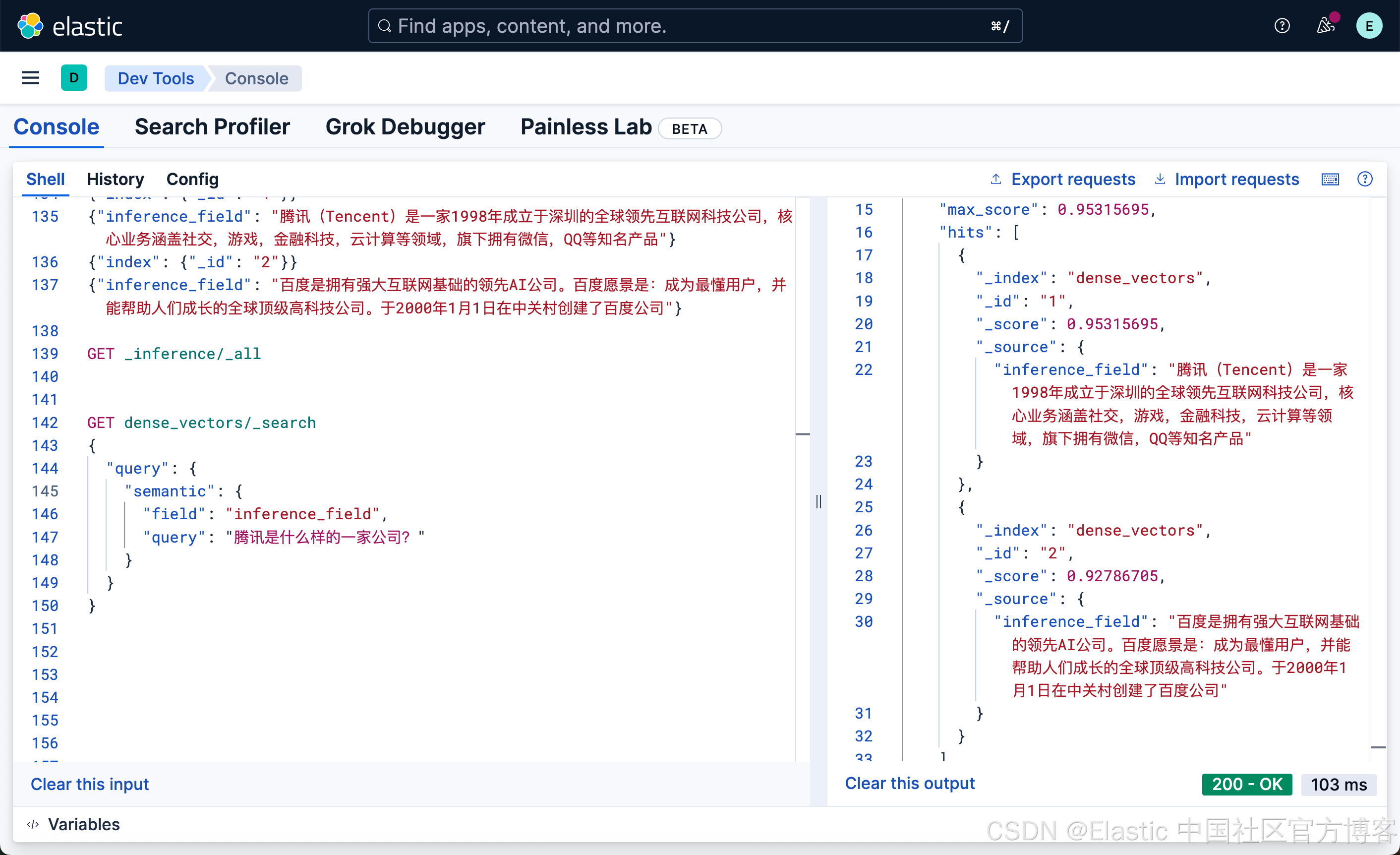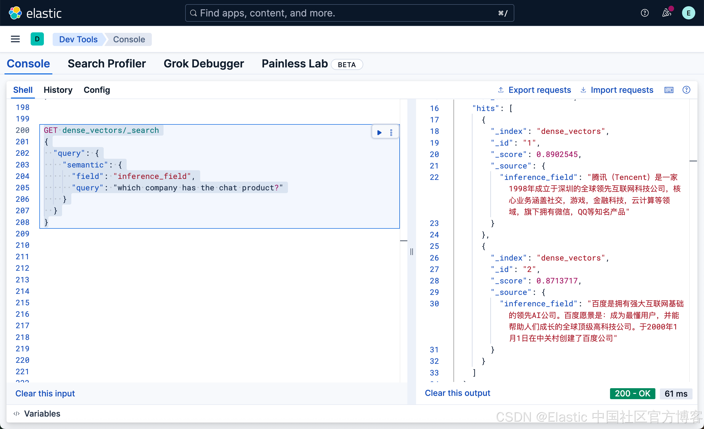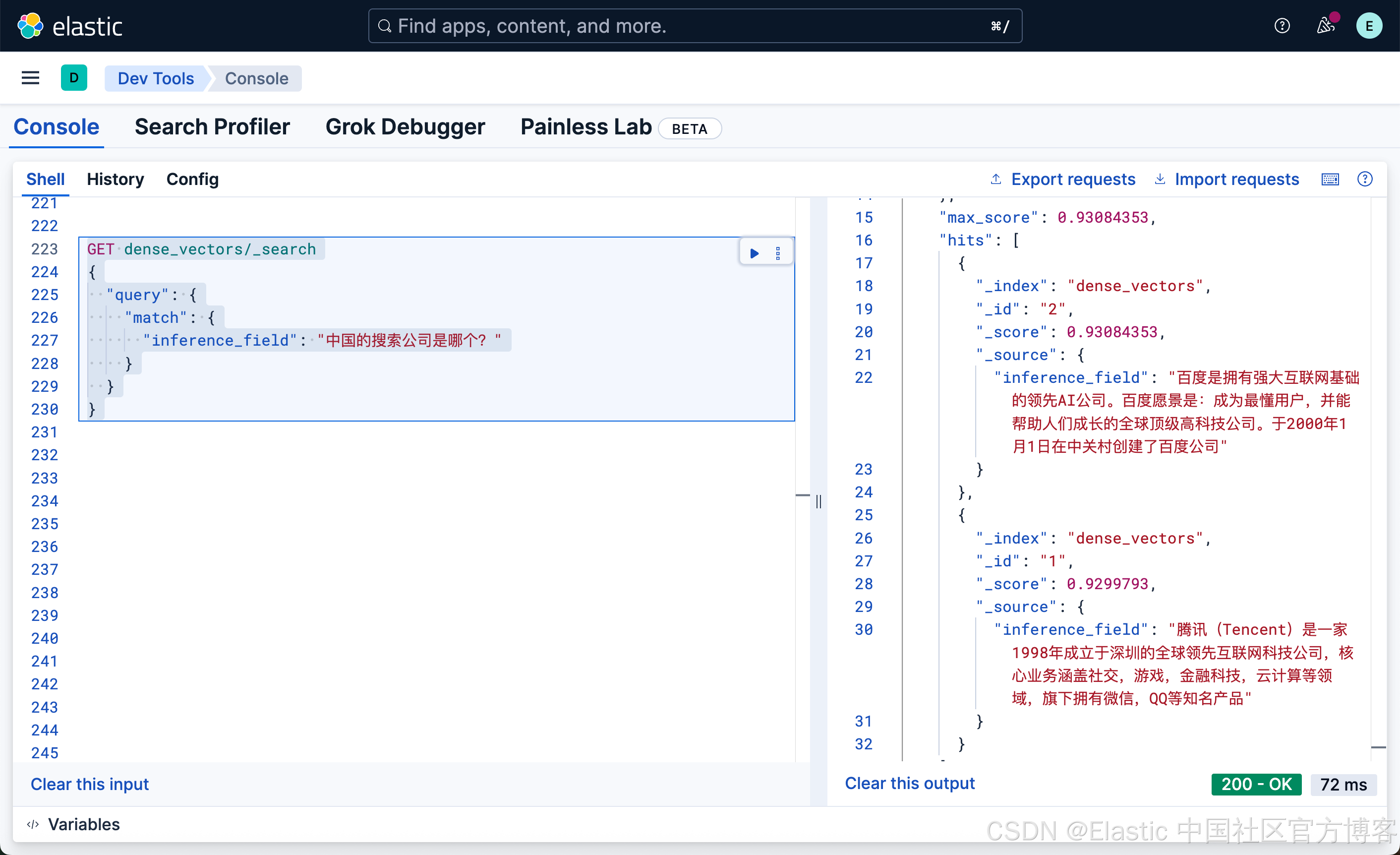 很显然,这种写法和我们之前的 DSL 的 match 写法没有任何的区别,尽管 inference_field 是一个向量字段。相比较之前的词汇搜索: