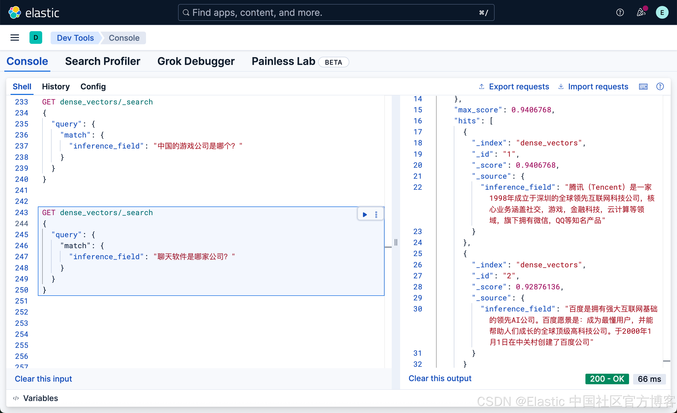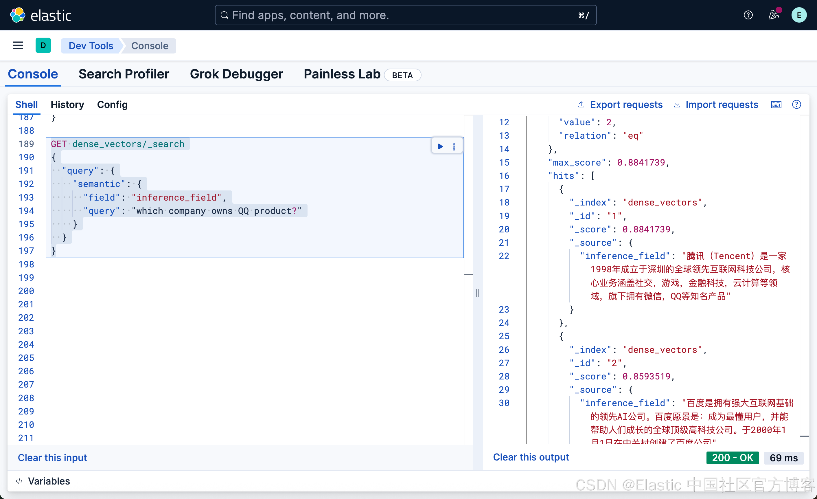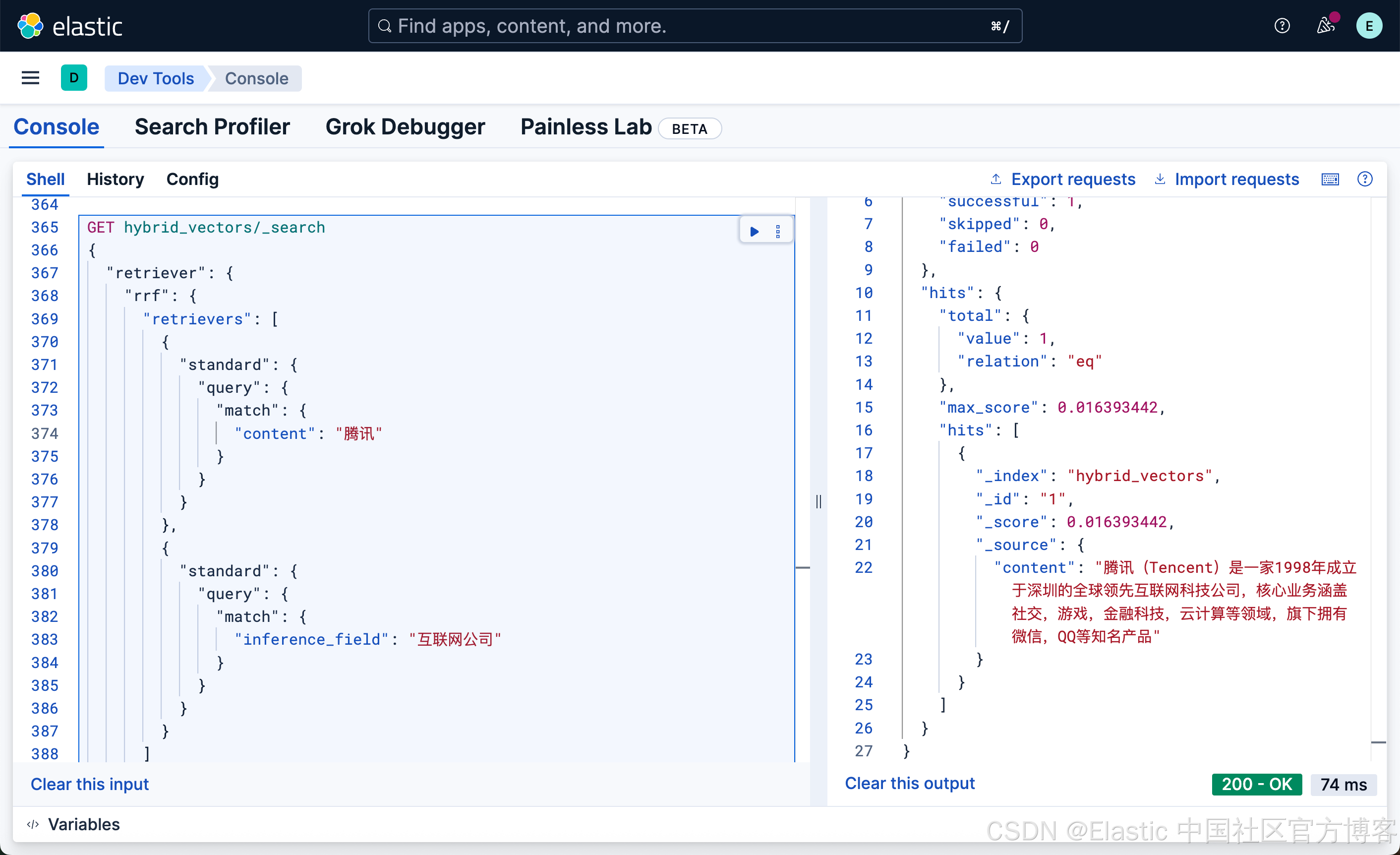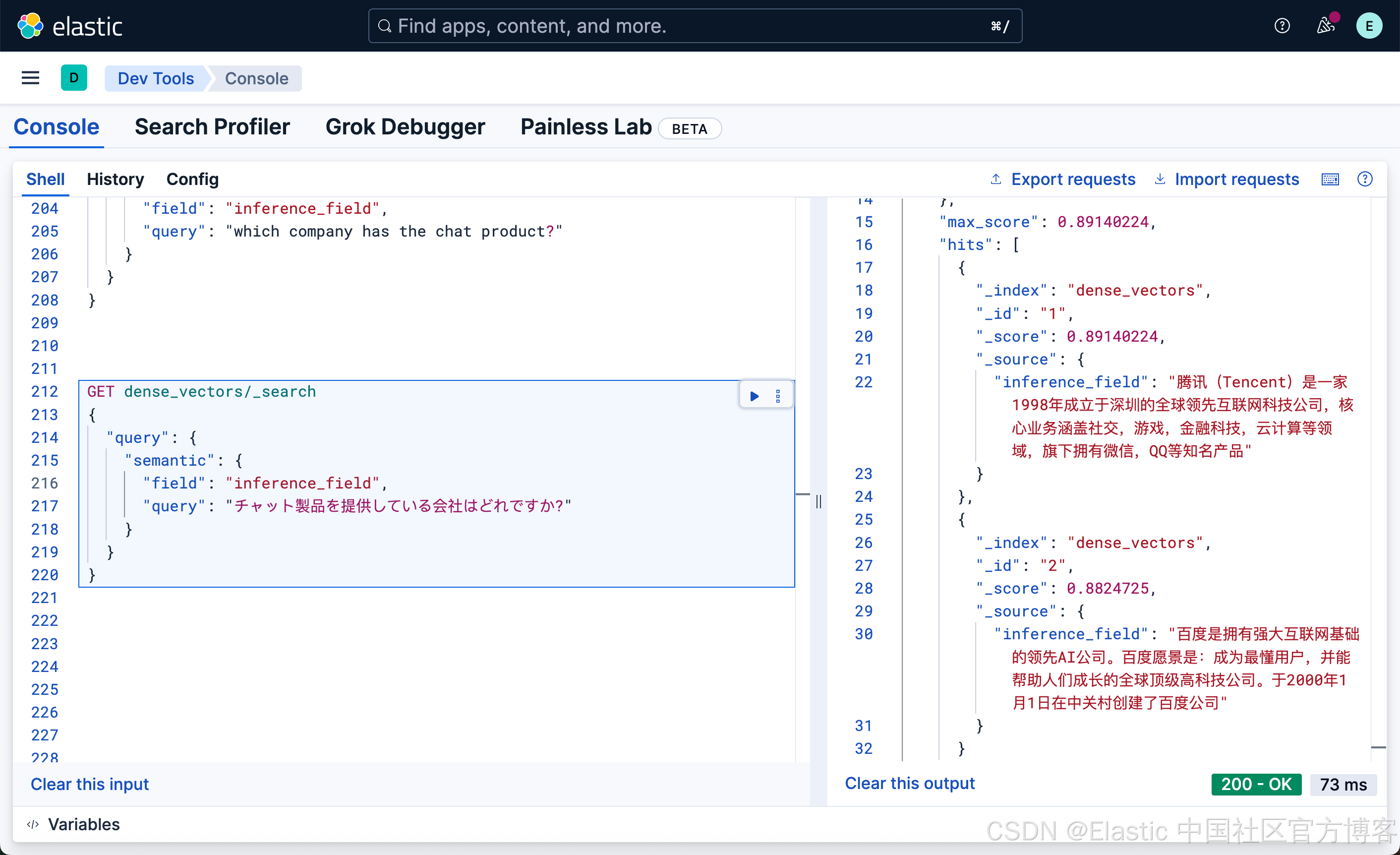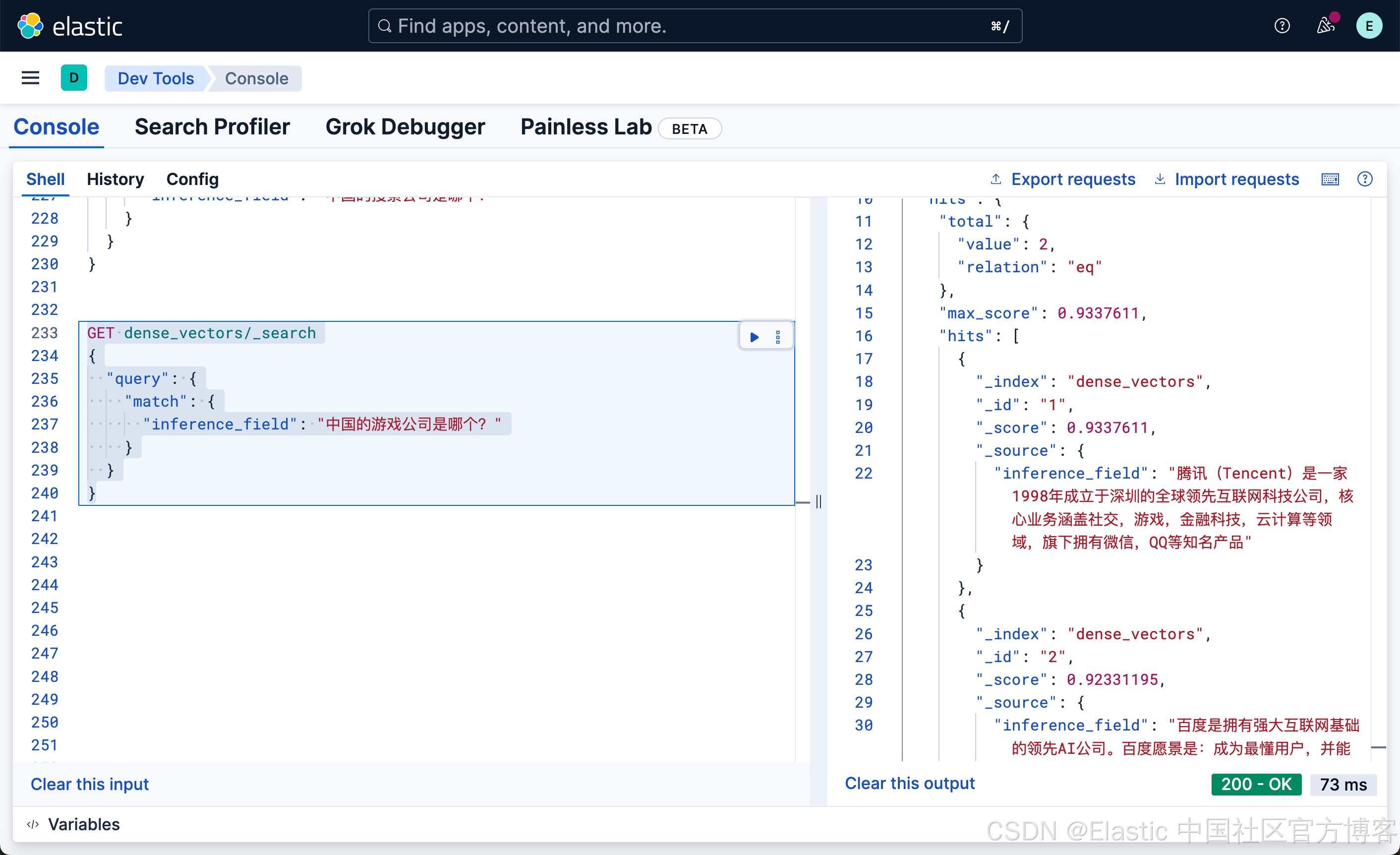 很显然,这种写法和我们之前的 DSL 的 match 写法没有任何的区别,尽管 inference_field 是一个向量字段。相比较之前的词汇搜索: