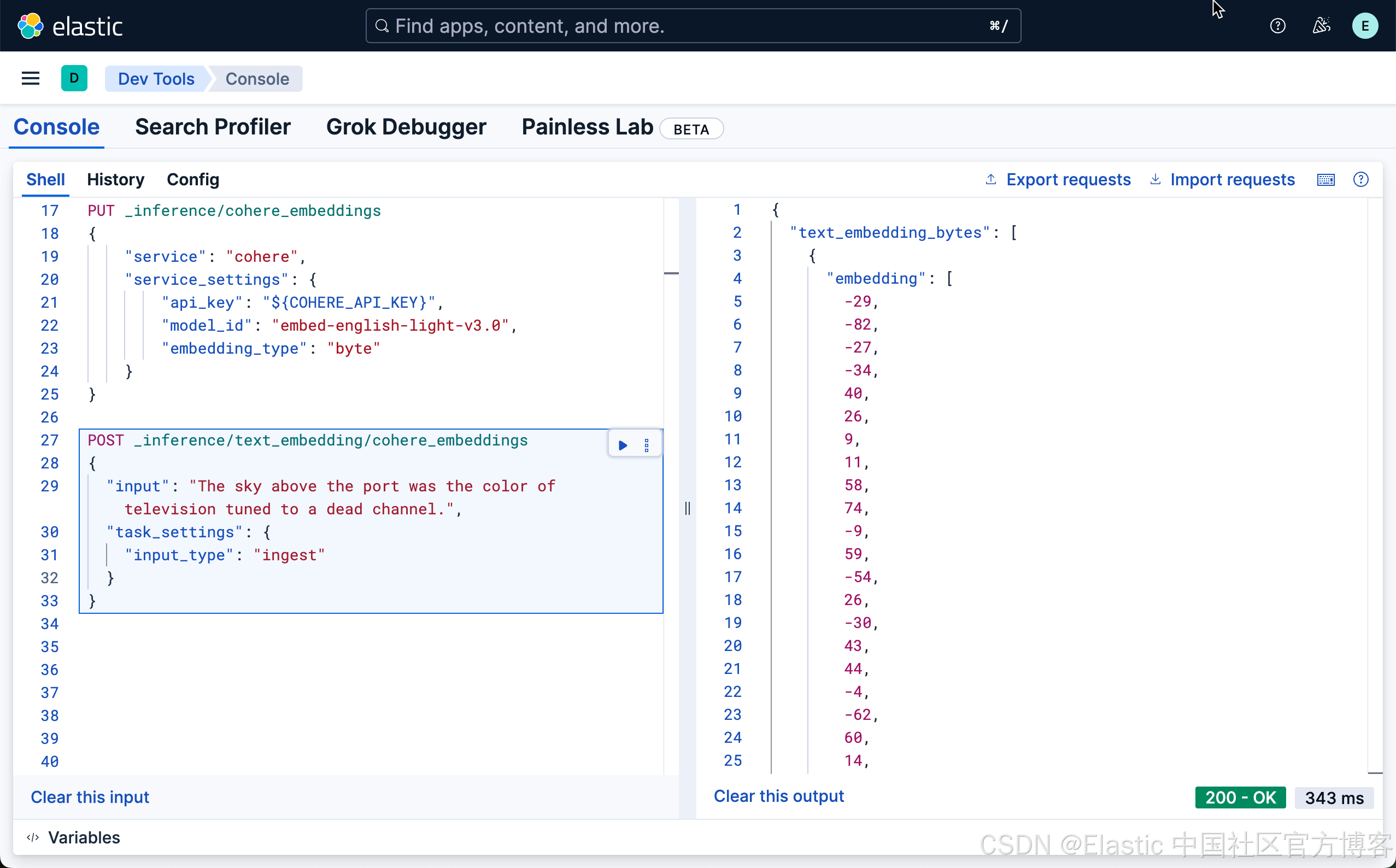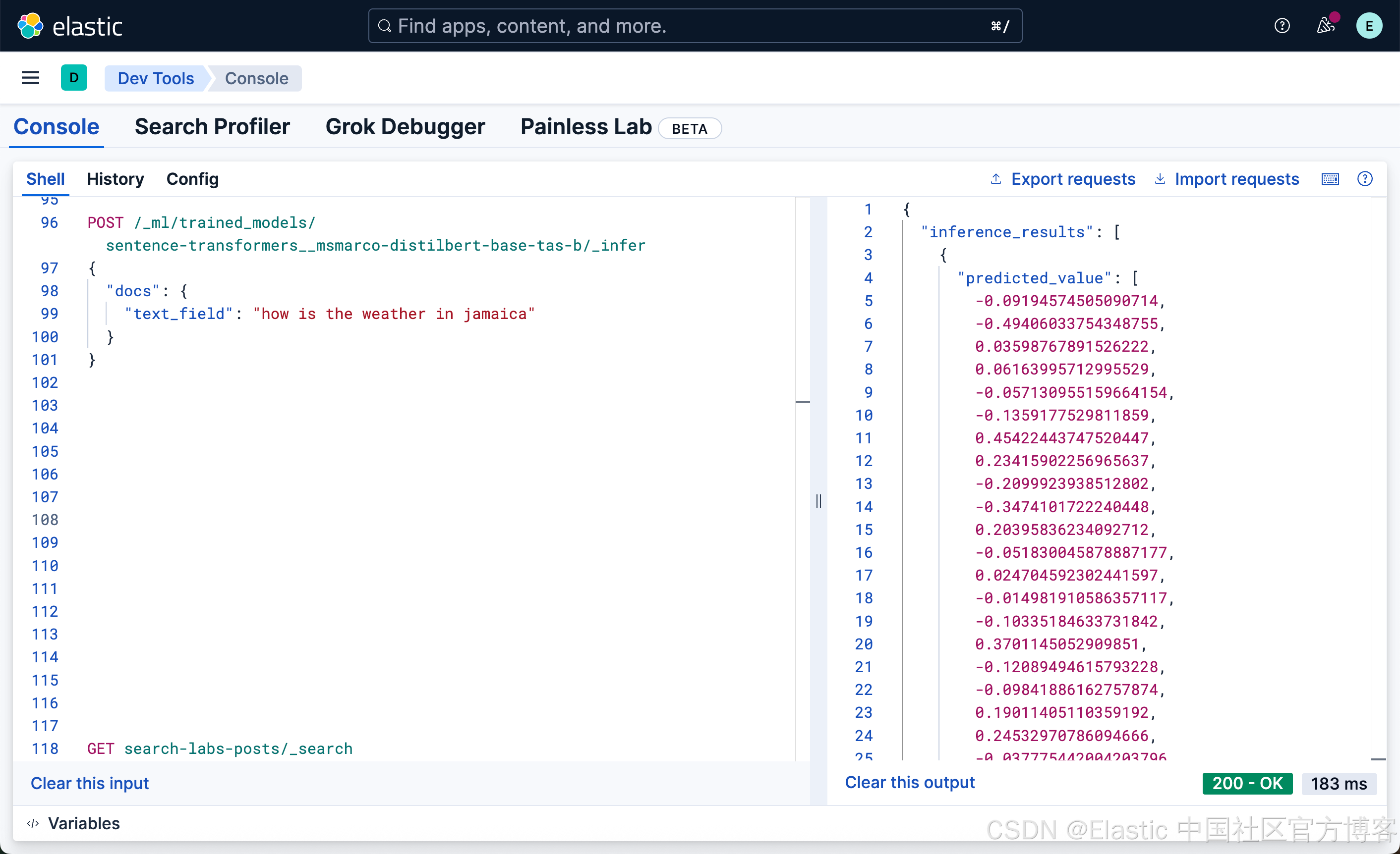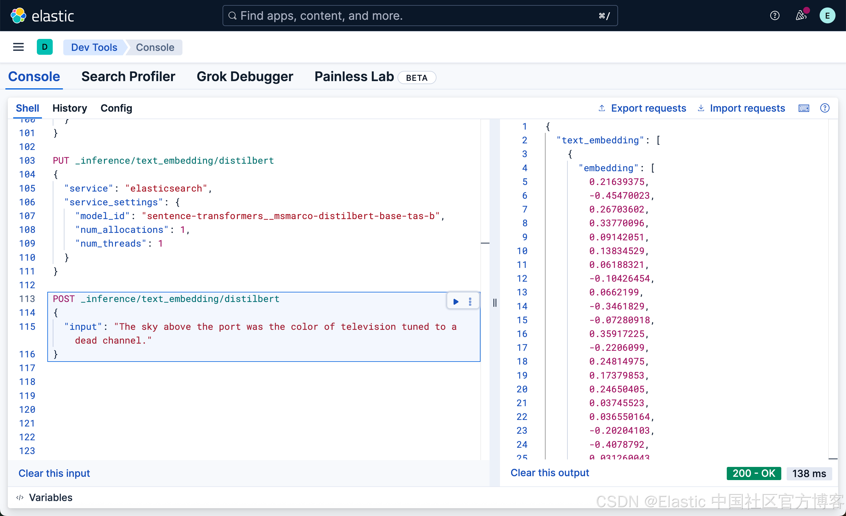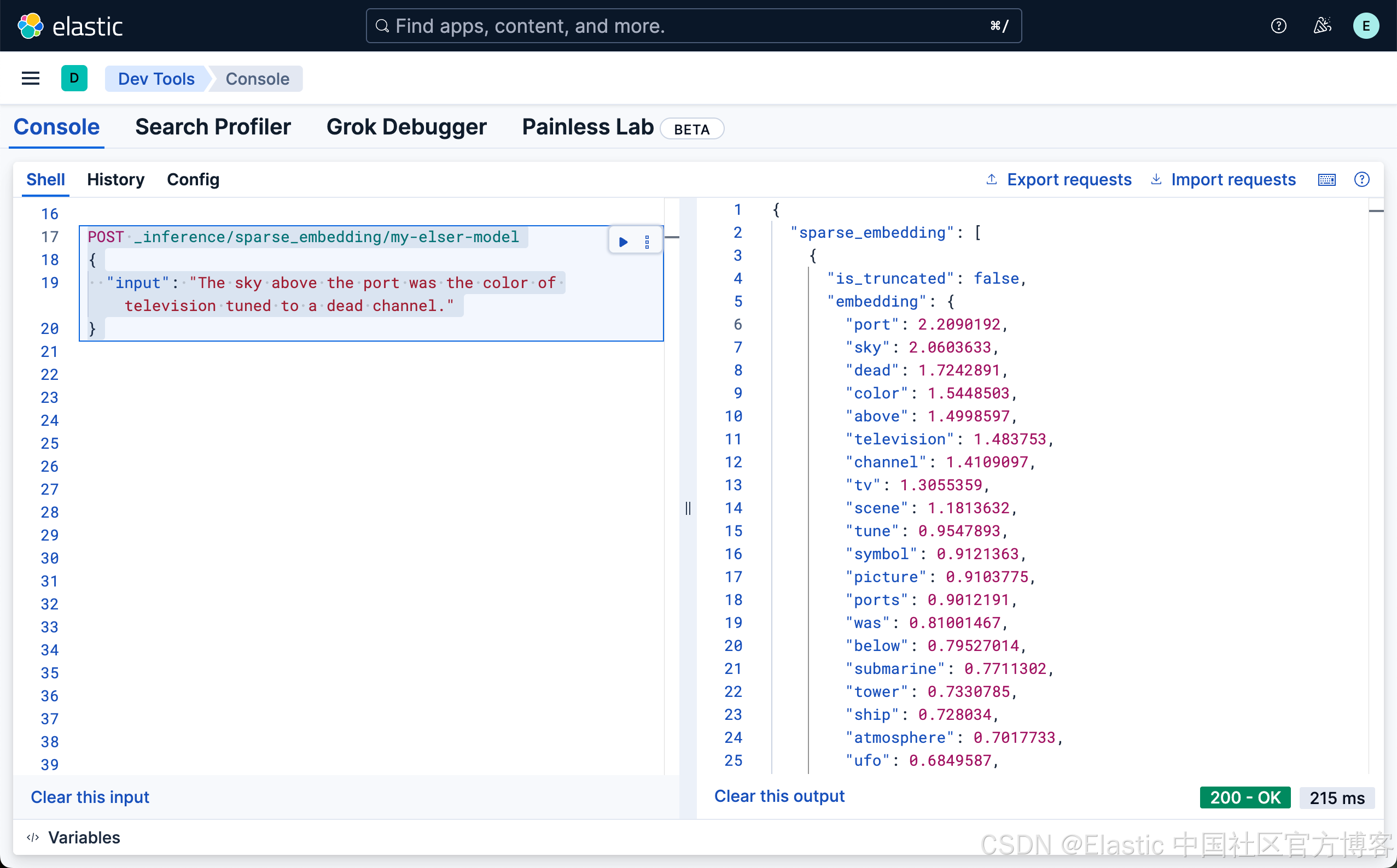 接下来,我们使用如下的命令来进行测试我们刚才创建的 ELSER 推理端点: