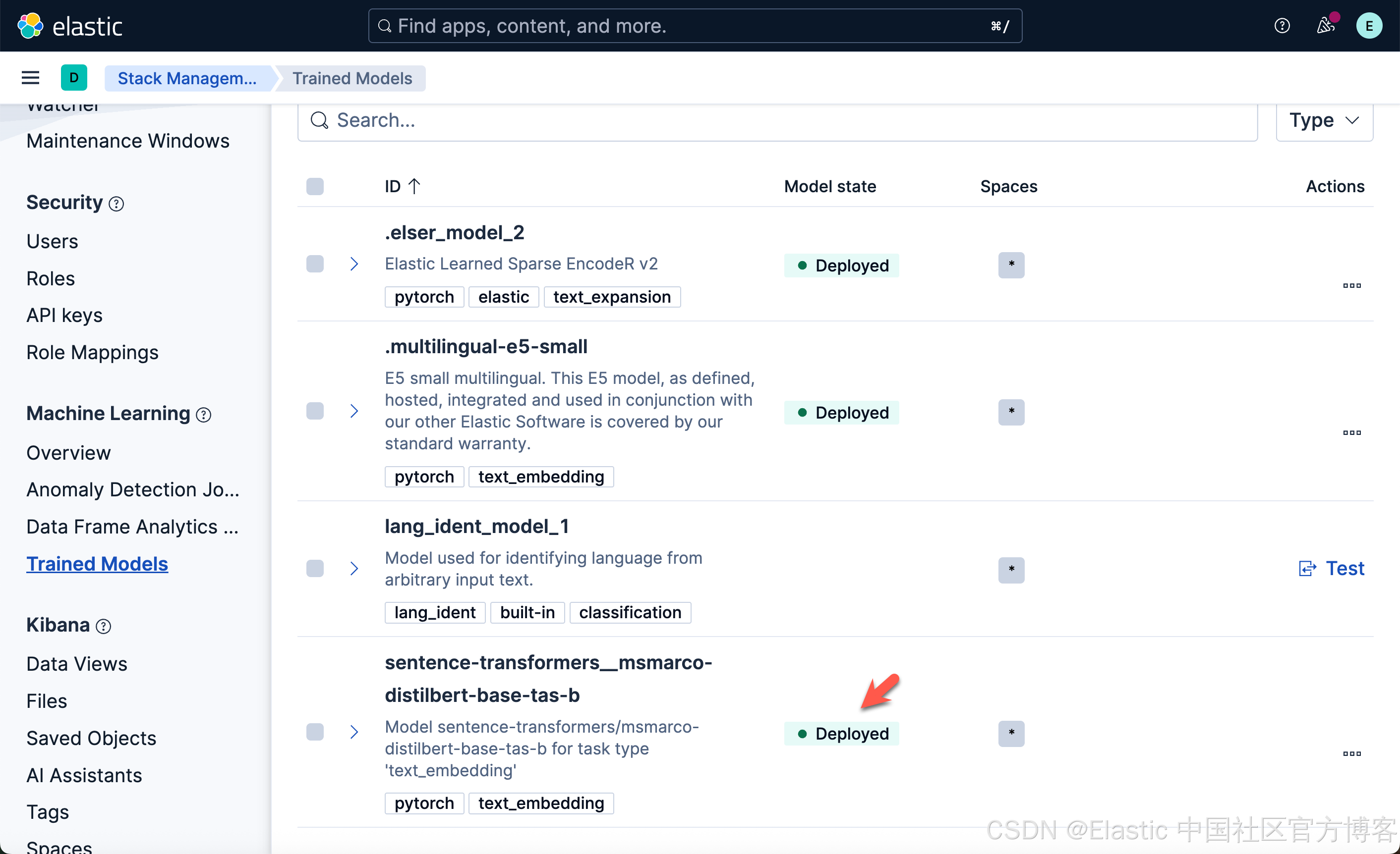 我们可以看到上面的两个模型都已经部署好了。如果你想部署其它的模型,可以参考文章 “Elasticsearch:如何部署 NLP:文本嵌入和向量搜索” 使用 eland 来上传模型。