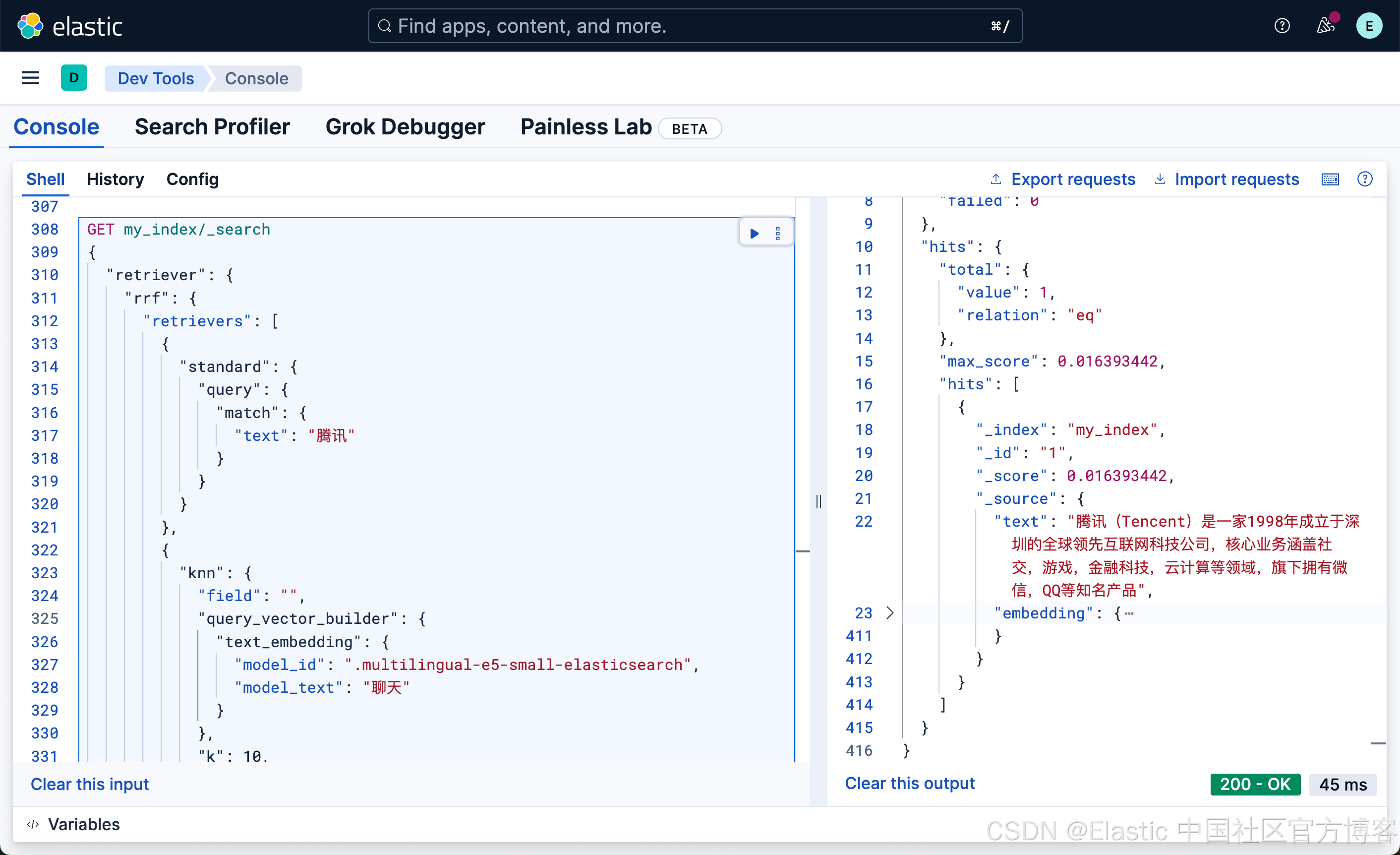 {"retriever": {"rrf": {"retrievers": [{"standard": {"query": {"match": {"text": "腾讯"}}}},{"knn": {"field": "","query_vector_builder": {"text_embedding": {"model_id": ".multilingual-e5-small-elasticsearch","model_text": "聊天"}},"k": 10,"num_candidates": 100}}]}}
