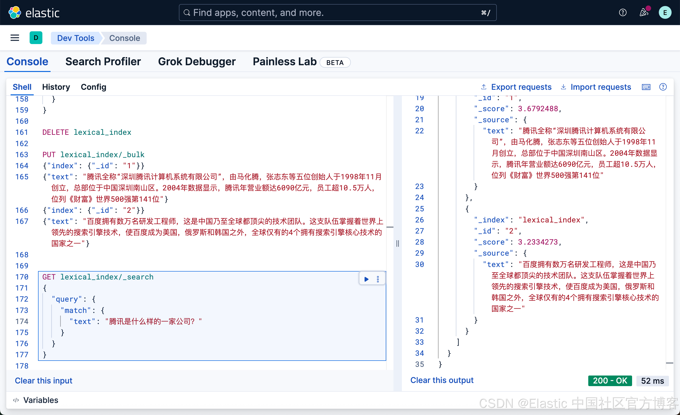很显然,含有腾讯的文档排名是第一的,尽管百度的结果也出现了。因为我们只有两个文档,含有百度的文档的得分没有腾讯的高,所以排在第二位。