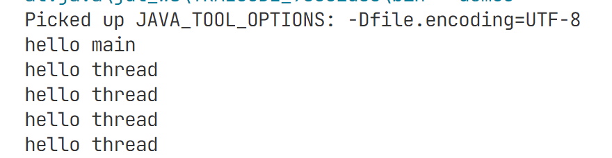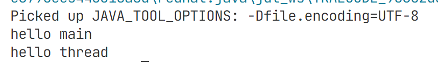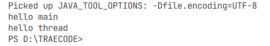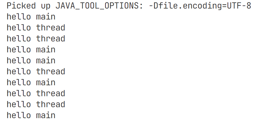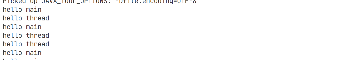 class myThread extends Thread{@Overridepublic void run() {while(true){try {System.out.println("hello thread");Thread.sleep(1000);} catch (InterruptedException e) {e.printStackTrace();}}}}public class demo1 {public static void main(String[] args) {Thread thread = new myThread();thread.start();while(true){try {System.out.println("hello main");Thread.sleep(1000);} catch (InterruptedException e) {e.printStackTrace();}}}