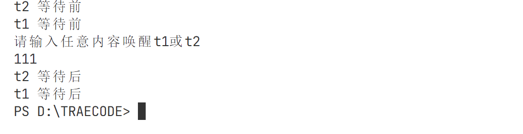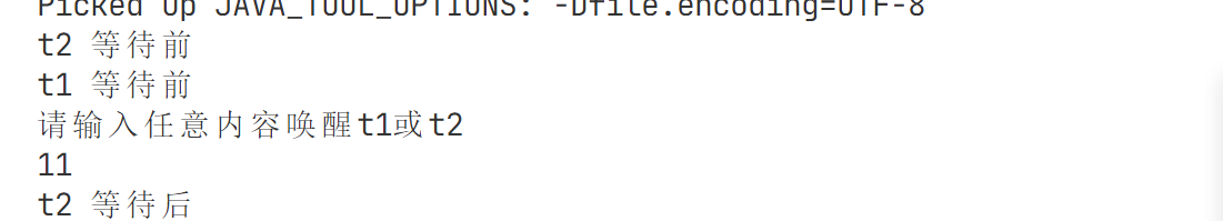 输出:此时t3只会唤醒t1或t2其中一个。我这里运行唤醒了t2