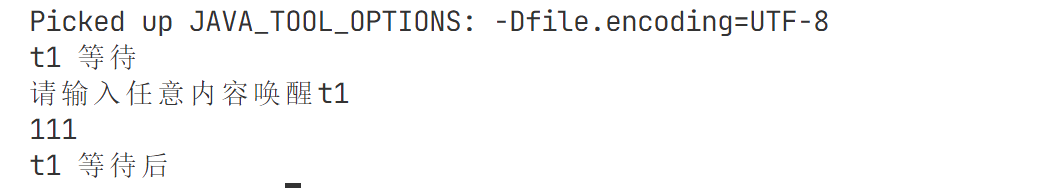 import java.util.Scanner;public class demo_notify {public static Object locker = new Object();public static void main(String[] args) {Thread t1 = new Thread(() -> {System.out.println("t1 等待");synchronized (locker) {try {locker.wait();} catch (InterruptedException e) {e.printStackTrace();}}System.out.println("t1 等待后");});Thread t2 = new Thread(() -> {System.out.println("请输入任意内容唤醒t1");Scanner scanner = new Scanner(System.in);scanner.next();synchronized (locker) { locker.notify();}});t1.start();t2.start(); }}