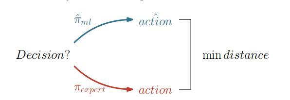 在演示环境中,通过最大限度地减少行动空间中的差异,对决策进行训练以再现专家决策的行动。