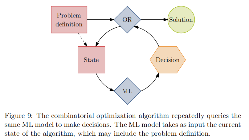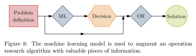 在许多情况下,仅使用机器学习来解决问题可能不是最合适的方法。相反,可以应用机器学习来为组合优化算法提供附加信息,如图8所示,机器学习模型用于使用有价值的信息来增强运筹学算法。