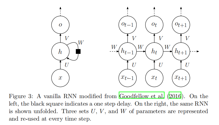 从宏观层面来看,这些架构的设计初衷就是处理不同结构的数据。它们的使用方式——尤其是学习过程——与前文介绍的基础前馈神经网络仍高度相似。首先介绍的架构是循环神经网络(RNN)。这类模型通过在序列步骤间共享参数来处理连续数据。具体来说,同一神经网络模块会在序列的每个步骤中被重复应用,即在每个时间步都保持相同的架构和参数值。这种网络的独特之处在于其包含循环层:其输入既包括前一层的激活向量,也包括其在前一个序列步骤中的激活向量(称为隐藏状态向量),如图3所示。
