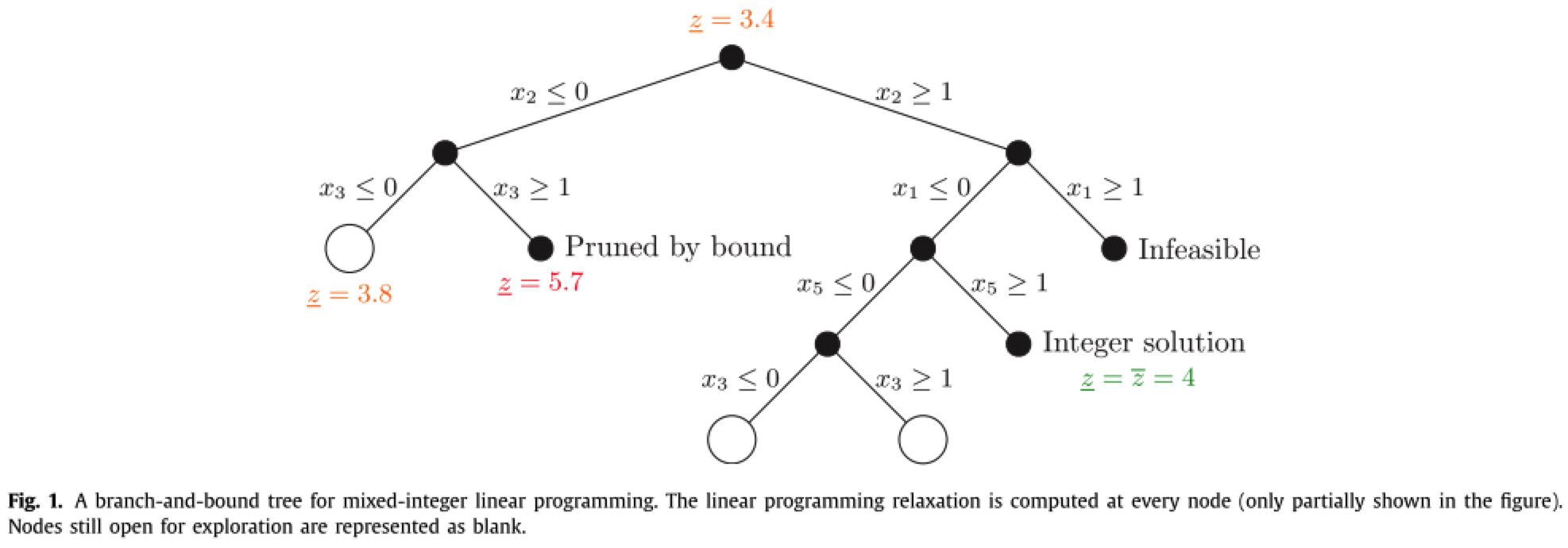 图解释:用于混合整数线性规划的分支定界树。 在每个节点处计算线性规划松弛(图中仅部分显示)。 仍然开放供探索的节点表示为空白。