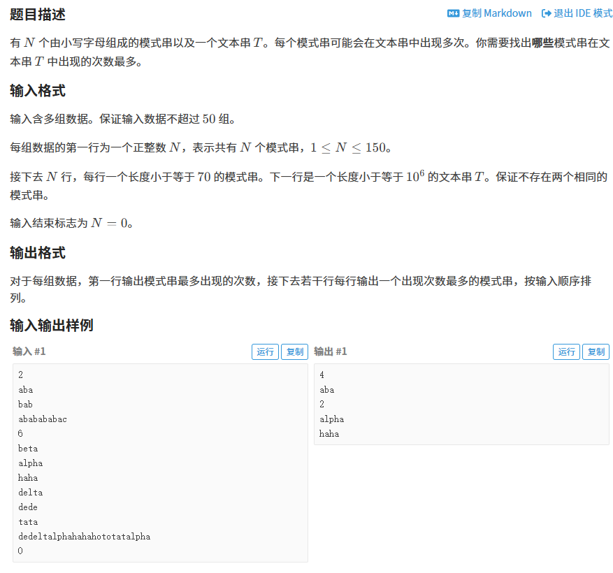 void solve() {AC.init();vector<string >f(n);for (int i = 0; i < n; i++) {cin >> f[i];AC.insert(f[i]);}AC.build();string s;cin >> s;AC.search(s);int max_f = 0;for (int i = 0; i < AC.insi; i++) {max_f = max(AC.time[AC.ins[i]], max_f);}cout << max_f << endl;for (int i = 0; i < AC.insi; i++) {if (AC.time[AC.ins[i]] == max_f) {cout << f[i] << endl;}}return;
