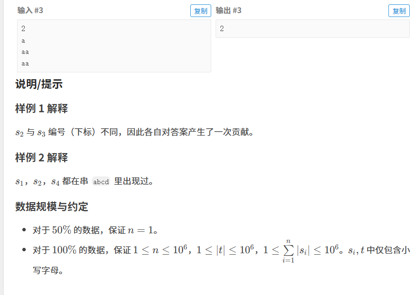 struct {int trie[MAX0][26], cnt = 0;//字典树(a~z)int output[MAX0]; // 输出标记,及以此位置结尾的的模式串有多少个;(很少用)int fail[MAX0];//失配指针int ins[MAXN], insi;//输入第i个模式串的结尾位置vector<int> ins;int time[MAX0]; // 在匹配串中,这个位置出现过多少次;// 初始化void init() {memset(trie, 0, sizeof(trie));memset(fail, 0, sizeof(fail));memset(ins, 0, sizeof(ins));memset(output, 0, sizeof(output));memset(time, 0, sizeof(time));cnt = 0, insi = 0;}void inittime() {memset(time, 0, sizeof(time));}//插入模式串,建立tire树(字典树)void insert(string s) {int sn = s.size();int i = 0;for (int z = 0; z < sn; z++) {int j = s[z] - 'a';if (!trie[i][j]) {trie[i][j] = ++cnt;}i = trie[i][j];}ins[insi++] = i;output[i]++;}// 构建失配指针+建立直通表(优化trie)(避免绕圈)void build() {queue<int> q;for (int j = 0; j < 26; j++) {if (trie[0][j] != 0) {fail[trie[0][j]] = 0;q.push(trie[0][j]);}}while (!q.empty()) {int u = q.front();q.pop();for (int j = 0; j < 26; j++) {if (trie[u][j] != 0) {fail[trie[u][j]] = trie[fail[u]][j];q.push(trie[u][j]);}else {trie[u][j] = trie[fail[u]][j];}}}}//建立fail的反树,避免遍历文章时绕圈void opposedfail() {vector<vector<int>> opposed(cnt+1, vector<int>());vector<bool> visited(cnt + 1, false);for (int i = 1; i <= cnt; i++) {opposed[fail[i]].push_back(i);}stack<int> q;q.push(0);while (!q.empty()) {int i = q.top();if (!visited[i]) {visited[i] = true;for (int j = 0; j < opposed[i].size(); j++) {q.push(opposed[i][j]);}}else {time[fail[i]] += time[i];q.pop();}}}//匹配串匹配void search(string s) {int sn = s.size();int i = 0;for (int z = 0; z < sn; z++) {int j = s[z] - 'a';time[trie[i][j]]++;i = trie[i][j];}opposedfail();}}AC;
