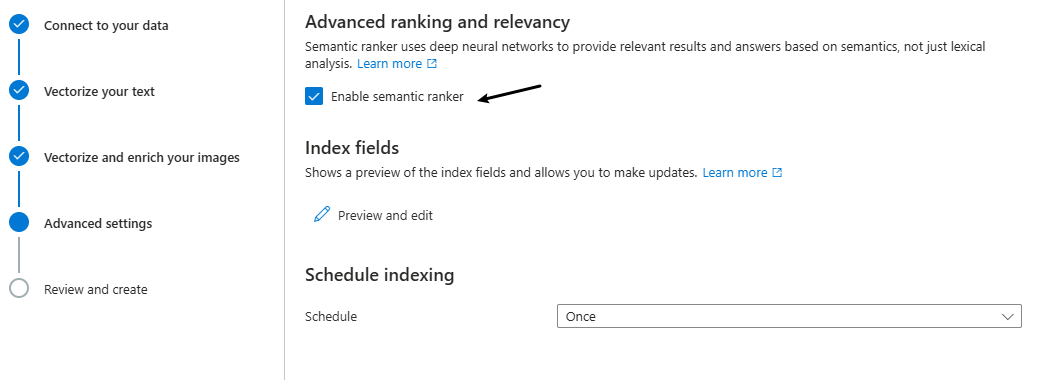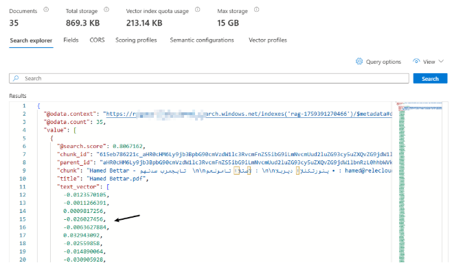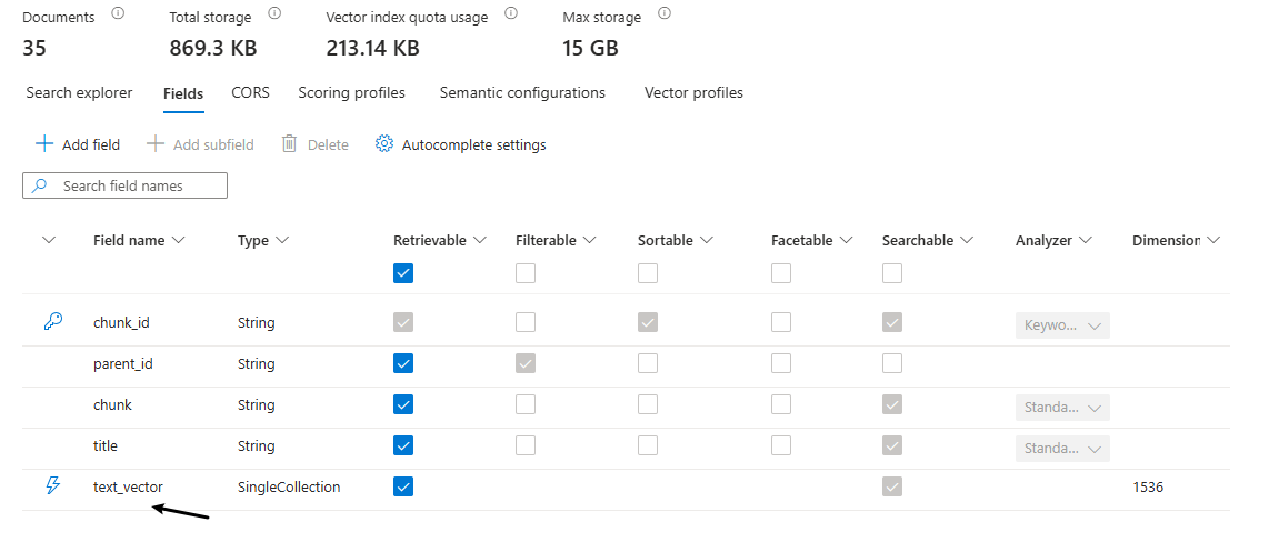10) 在创建的Azure AI Search index 的 Fields界面中,发现有vector field 产生,
