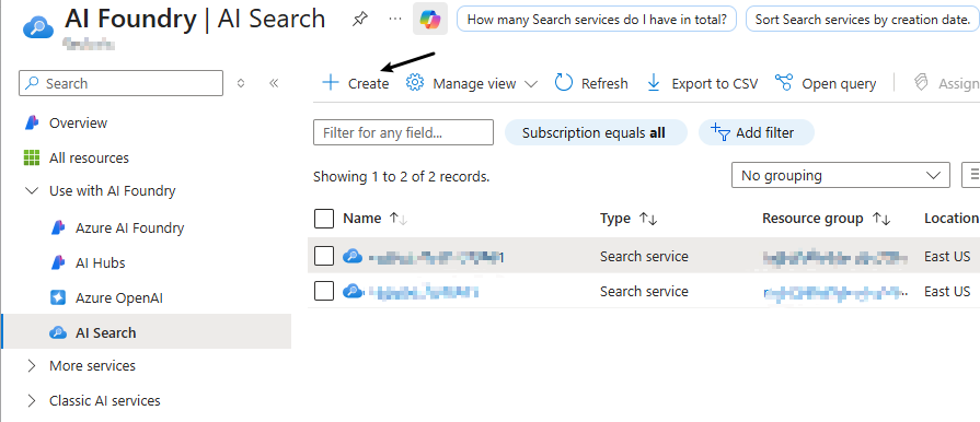 1) 在Azure portal 的Azure AI Foundry界面中,选择左侧的AI Search菜单,然后点击Create按钮,