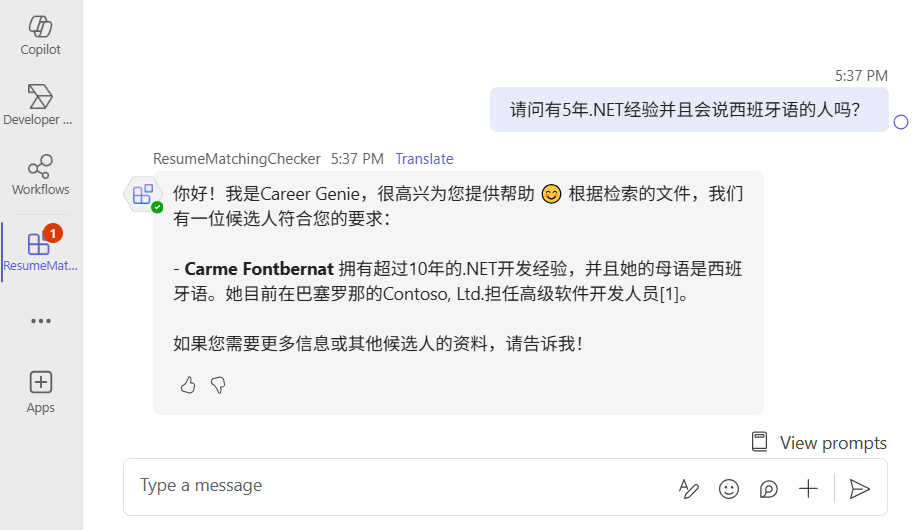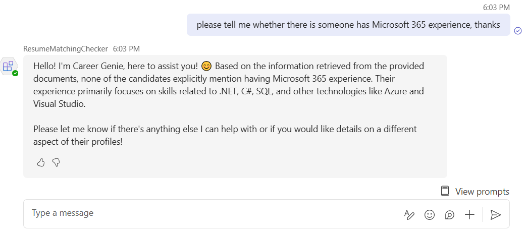 5) 最后输入想提问的问题,bot会通过Azure AI Search的vector search进行内容检索,并将检索结果提供给Azure Open AI作为上下文, 最后返回内容给bot同时bot返回内容给用户,如下图所示,