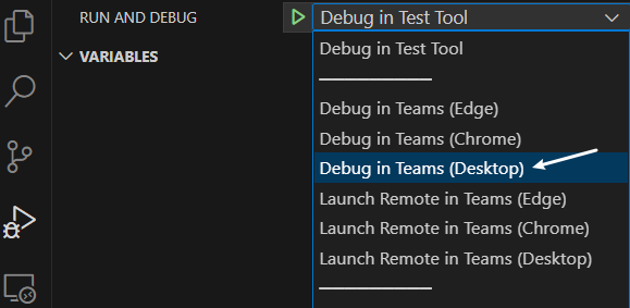 1) 在VSCode的项目中,点击RUN AND DEBUG下拉框,选择Debug in Teams(Desktop)并运行,