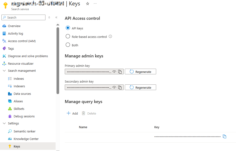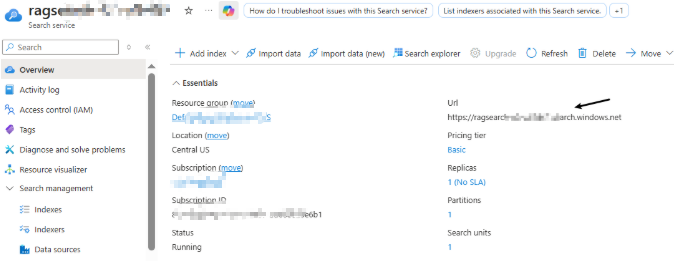 创建好Azure AI Search之后,需要记录一下Azure AI Search对应的endpoint和key,