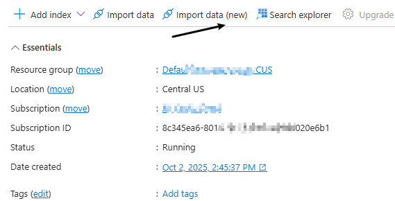 1) 在Azure AI Search界面中,点击import data(new)按钮,