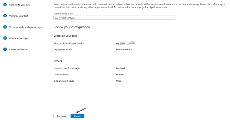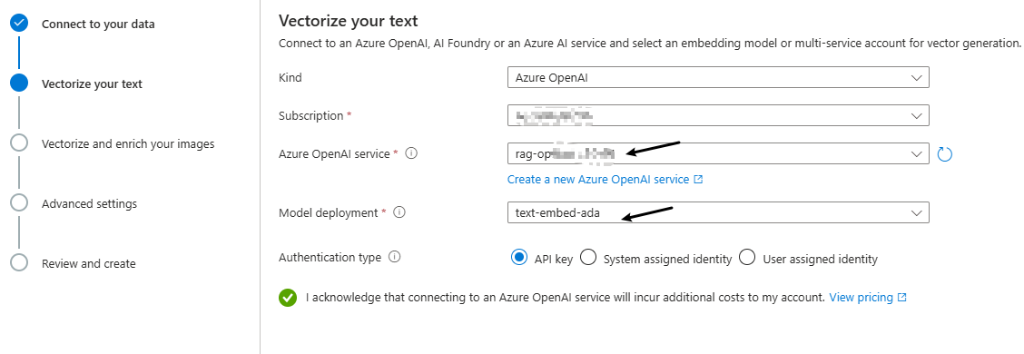5) 在Vectorize your text界面,选择Azure OpenAI service和embeding model,这边在Authentication type中选择的是API key,