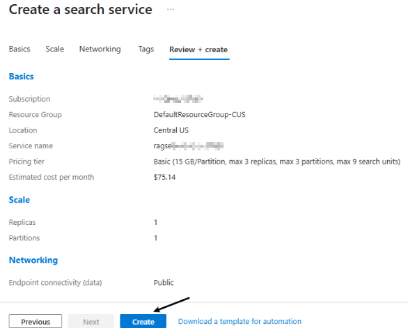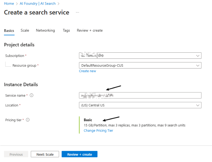2) 在Create a search service界面中,选择subscription和pricing tier,同时设定search name,