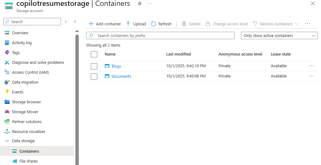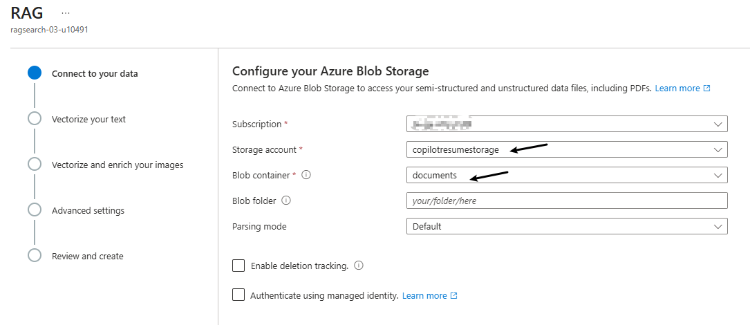 note, 这边假定已经创建了一个Azure blob storage,用于存放resumes,