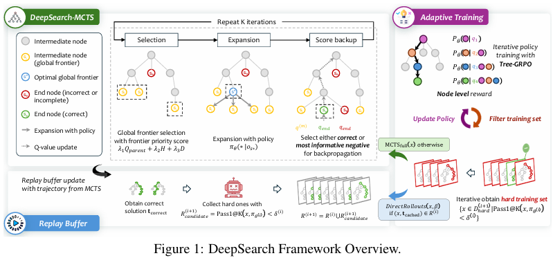 我们的贡献包括:(1)全局前沿节点选择策略,可跨搜索树优先选择高潜力节点;(2)基于熵的路径选择指导,能识别高置信度路径以进行监督;(3)采用带解缓存的自适应回放缓冲区训练机制以提升效率。在数学推理基准测试中的实验表明,DeepSearch的平均准确率达62.95%,为15亿参数推理模型树立了新的最优水平,且所需GPU小时数仅为扩展训练方法的5.7分之一。