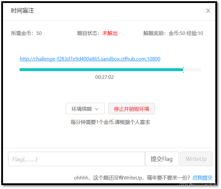 打开关卡( “SQL注入 - 时间盲注”)点击打开题目,如下所示,此时系统自动创建Docker环境,下图蓝色部分的URL地址就是靶场环境。