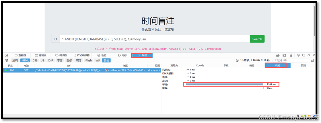 使用1 AND IF(LENGTH(DATABASE()) >0, SLEEP(2), 1)进行渗透,判断数据库的长度是否大于0,这是一个恒真的语句,如下所示。其核心原理是利用IF条件函数和SLEEP函数进行时间延迟判断:当数据库名长度大于0时,执行SLEEP(2)产生2秒延迟;否则立即返回1。