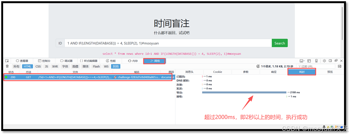 攻击者通过观察页面响应时间来判断条件真假——如果有明显延迟说明数据库名确实长度大于0。这种方法不依赖页面内容显示,而是通过响应时间差异来推断数据库信息。点击此报文,然后点击右下角的耗时,如下所示响应时间超过2000ms(2秒),说明sleep语句执行成功,该if条件成功,说明具有SQL时间型注入风险。