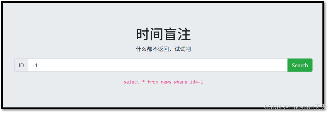 再次输入不存在的id(-1)观察页面是否输出,如下所示页面中除了SQL语句外,页面同样没有任何输出。由于无论查询成功还是失败,页面都没有输出,故而需要使用时间注入法。