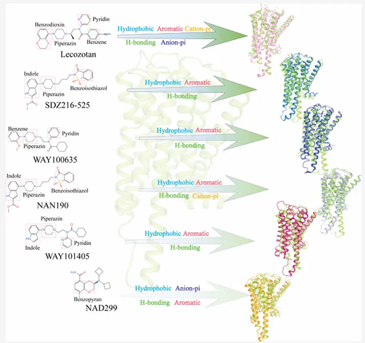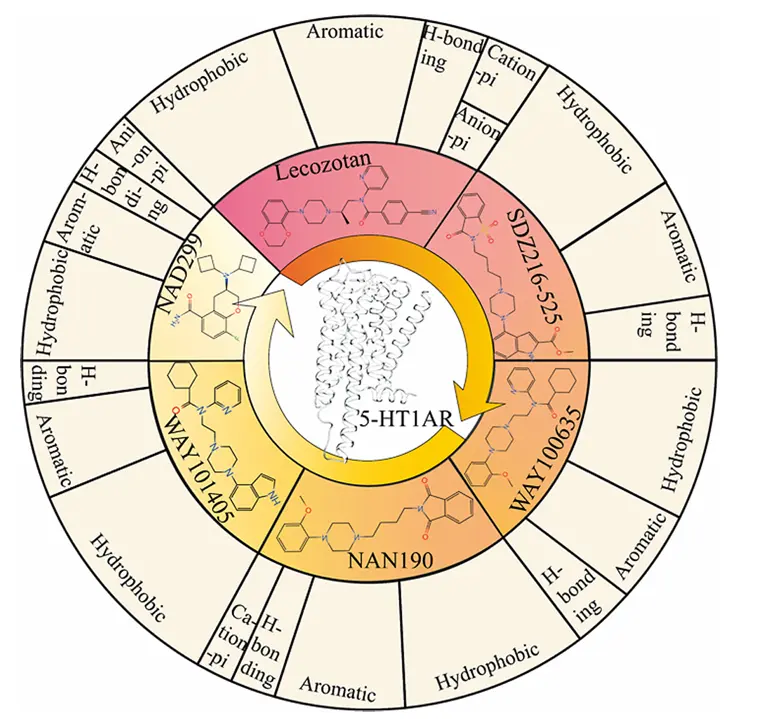 研究通过深入分析氢键、阳离子-π/阴离子-π及π-π堆叠相互作用,揭示了六种拮抗剂与5-HT₁AR结合的差异化分子机制。