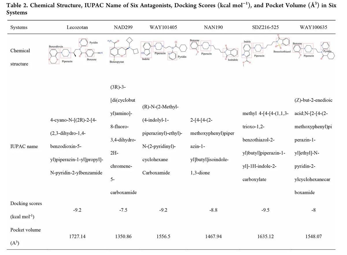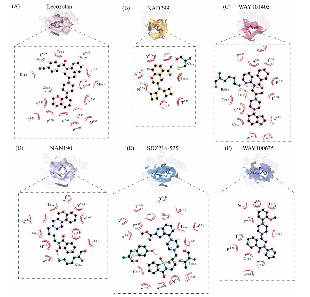 为进一步解析拮抗剂在结合口袋中的精细模式,我们分析了六种配体的药效团特征。所有拮抗剂均含芳香环共同药效团,除nad299外均具有哌嗪结构——这正是勒考唑坦、way101405、nan190、sdz216-525和way100635属于芳基哌嗪衍生物的原因。该结构常见于已获批抗焦虑、抗抑郁及抗精神病药物的5-HT₁AR靶向药物中,具有选择性或多靶点特性。