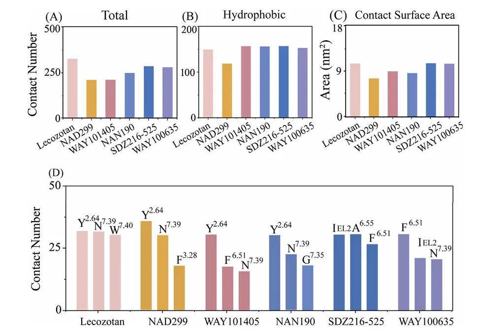 - 关键贡献:π-π堆叠在配体结合中扮演关键角色,Lecozotan表现出最高的π-π堆叠接触数,表明该作用是其结合的主要驱动力。