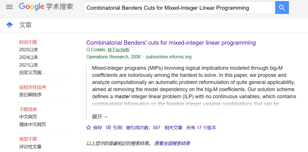 《Combinatorial Benders Cuts for Mixed-Integer Linear Programming》- 被引量 5百+