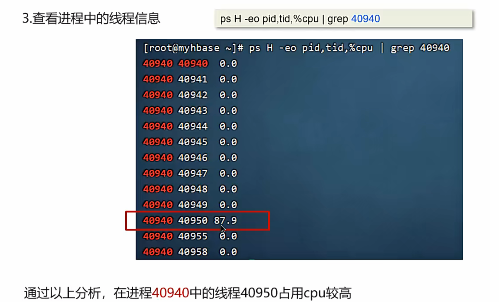 可以查看是哪一个进程占用cpu较高,上图所示的进程为:40940