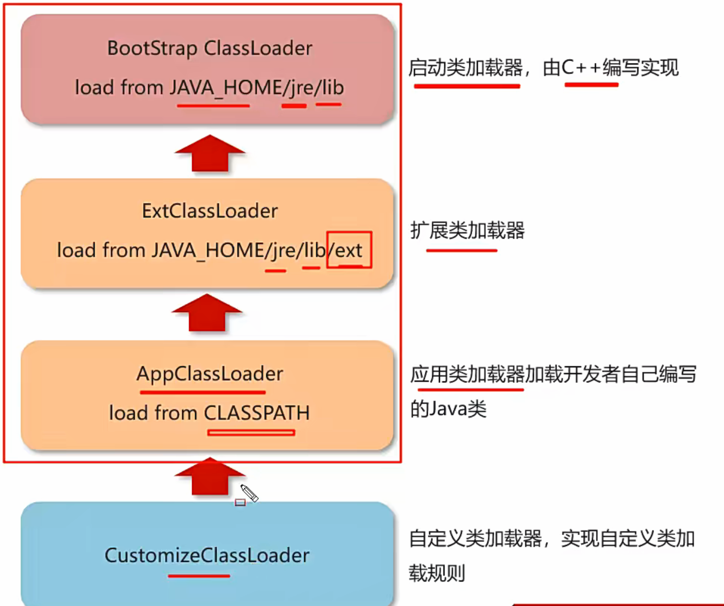 加载某一个类,先委托上一级的加载器进行加载,如果上级加载器也有上级,则会继续向上委托,如果该类委托上级没有被加载,子加载器尝试加载该类。