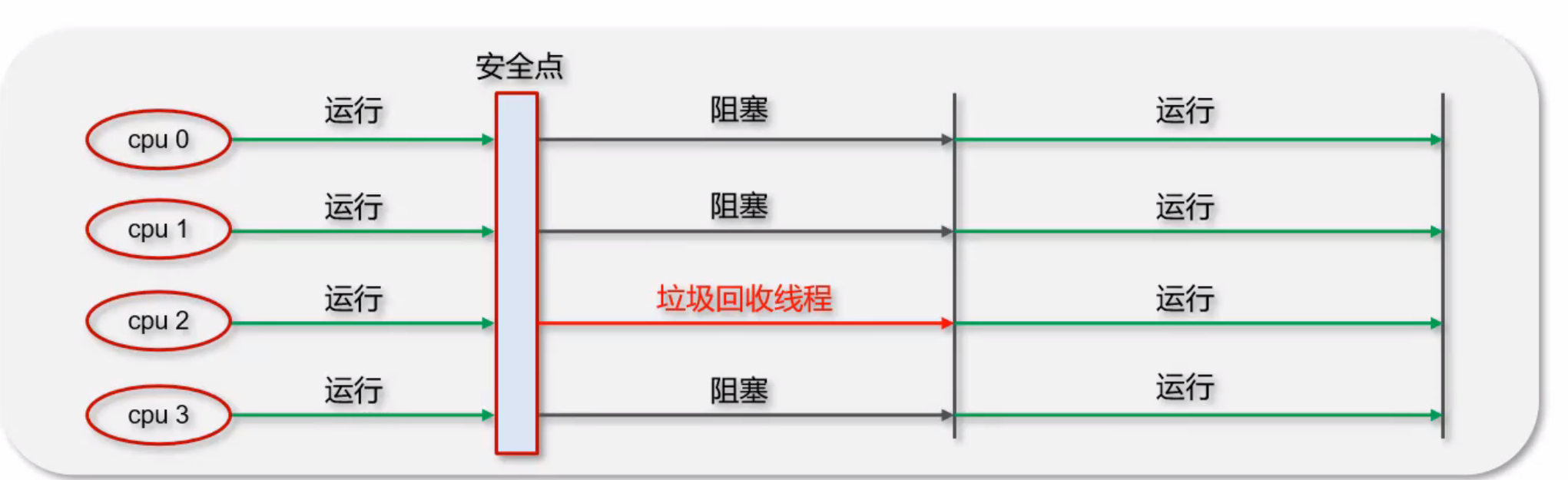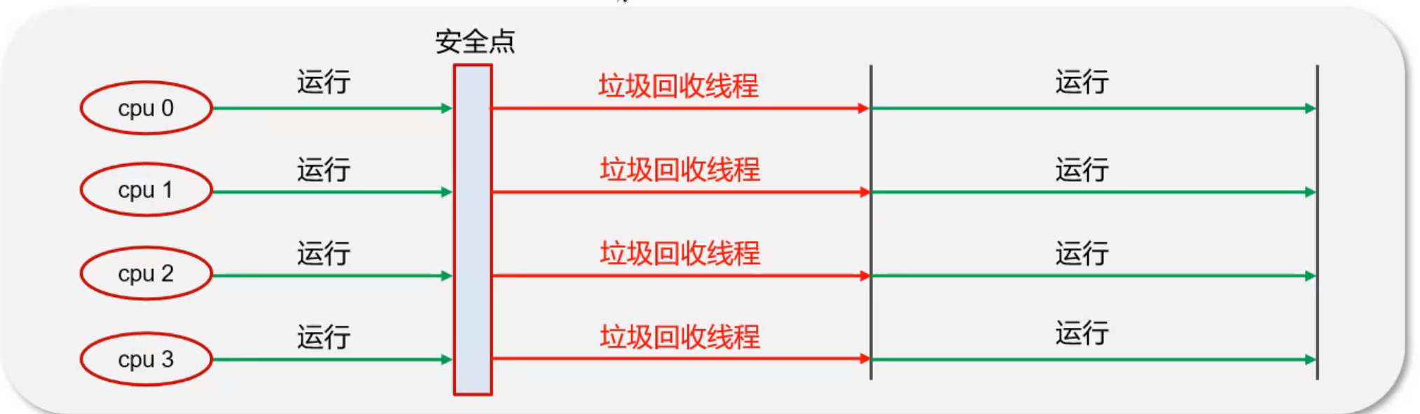 垃圾回收时,多个线程在工作,并且java应用中的所有线程都要暂停(STW), 等待垃圾回收的完成。