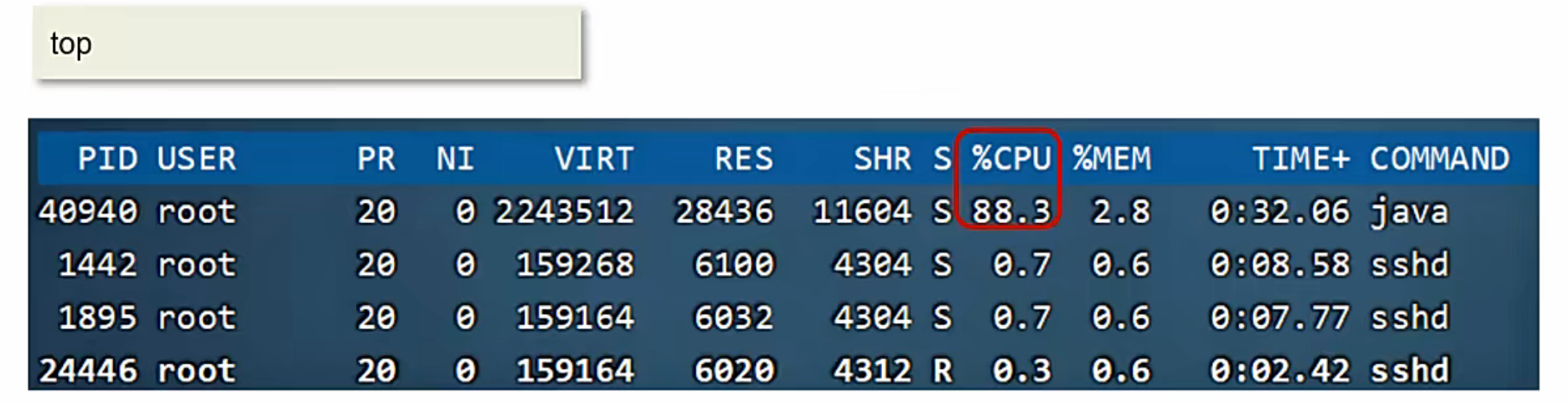 - 通过top命令查看后, 可以查看是哪一个进程占用cpu较高