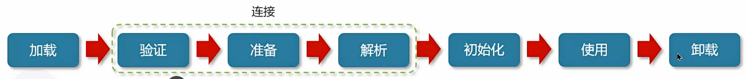 类从加载到虚拟机中开始,直到卸载为止,它的整个生命周期包括了:加载、验证、准备、解析、初始化、使用和卸载这7个阶段。其中,验证、准备和解析这三个部分统称为连接(linking)。