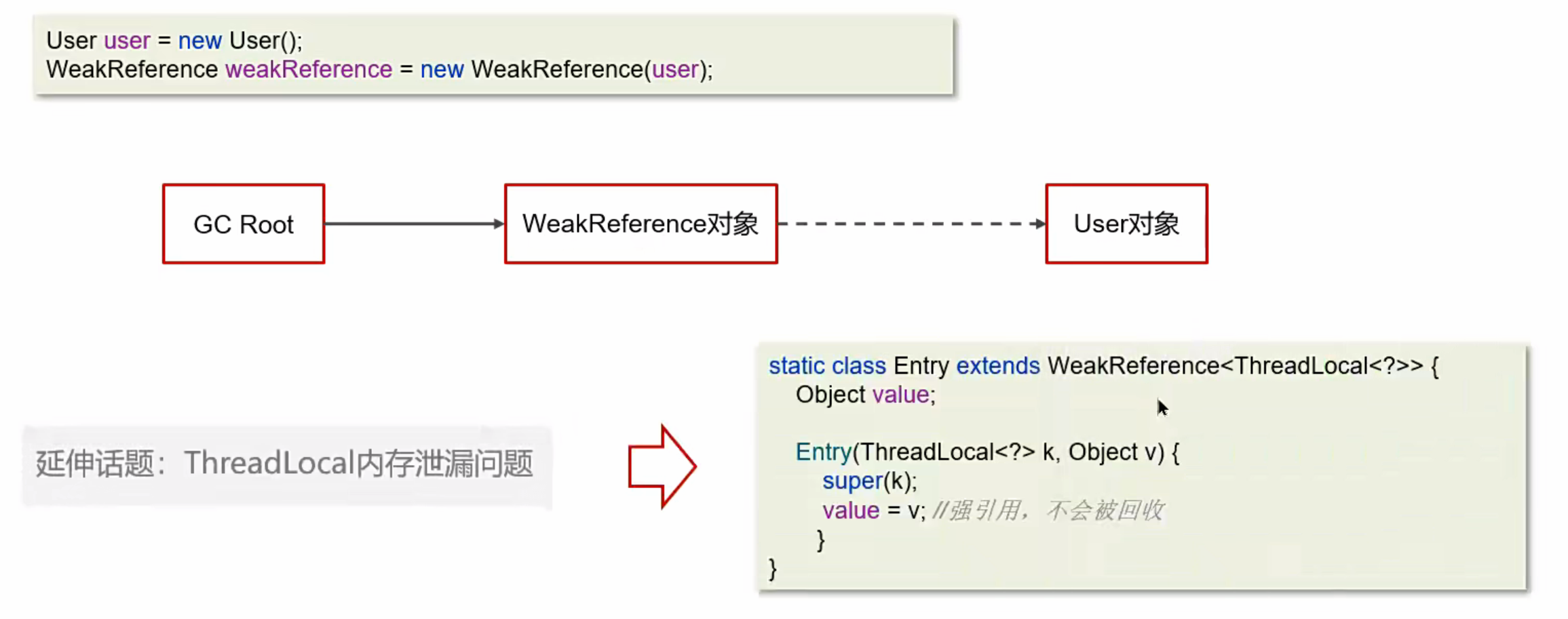 - 弱引用:仅有弱引用引用该对象时,在垃圾回收时,无论内存是否充足,都会回收弱引用对象