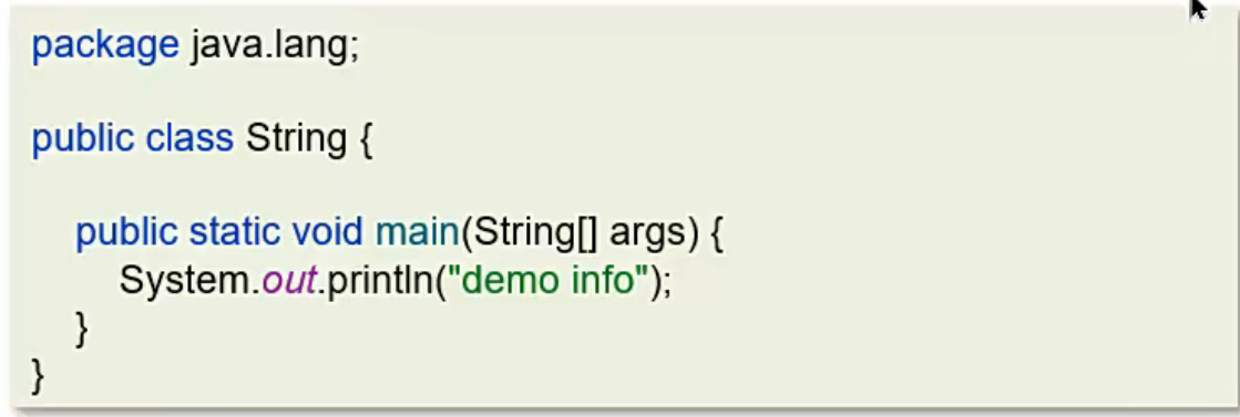 由于是双亲委派的机制, java.lang.String的在启动类加载器得到加载, 因为在核心jre库中有其相同名字的类文件, 但该类中并没有main方法。这样就能防止恶意篡改核心API库。