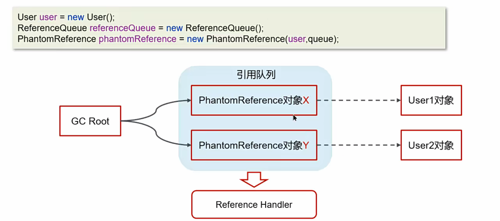- 虚引用:必须配合引用队列使用,被引用对象回收时,会将虚引用入队,由 Reference Handler 线程调用虚引用相关方法释放直接内存