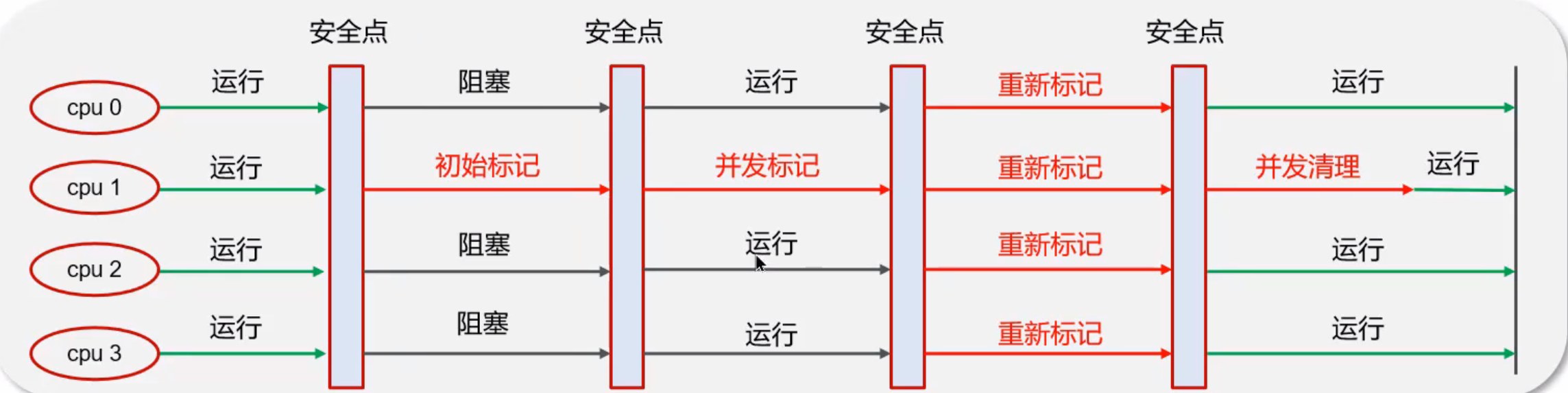 - 分成三个阶段:新生代回收、并发标记、混合收集