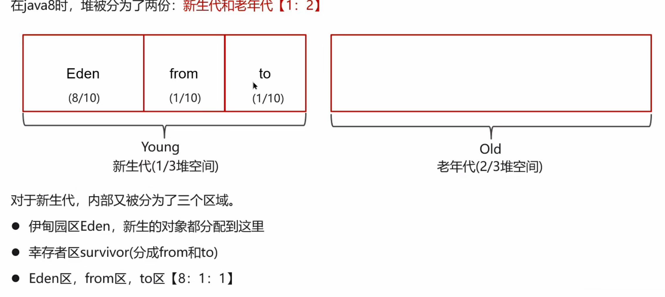 年轻代被划分为三部分,Eden 区和两个大小严格相同的 Survivor 区,根据 JVM 策略(对象先进入到 Eden 区,经过垃圾收集还存活,复制到 S0 或 S1),经过几次垃圾收集之后,依然存活于 Survivor 的对象将被放到老年代。