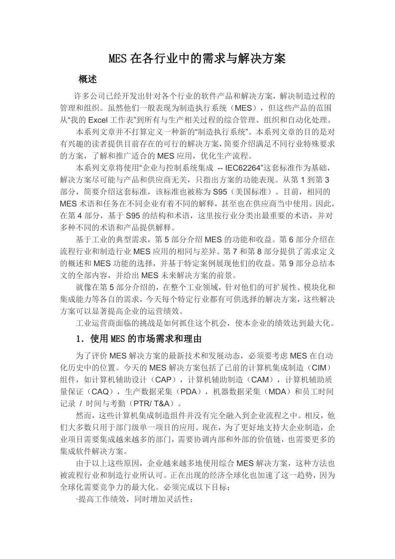 本文介绍了MES(制造执行系统)在各行业的需求与解决方案。文章重点阐述了MES的功能和收益,以及其在流程行业和制造行业的应用差异。文章还提到了使用MES的市场需求和理由,以及基于特定案例的MES功能选择和收益展现。