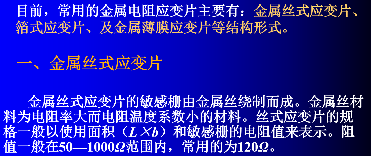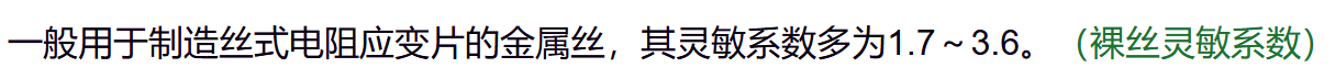 一般用于制造丝式电阻应变片的金属丝,其灵敏系数多为1.7~3.6。(裸丝灵敏系数)