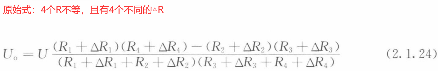 若电桥各臂均有相应的电阻增量∆R1、∆R2、∆R3和∆R4,则由式(2.1.23)得