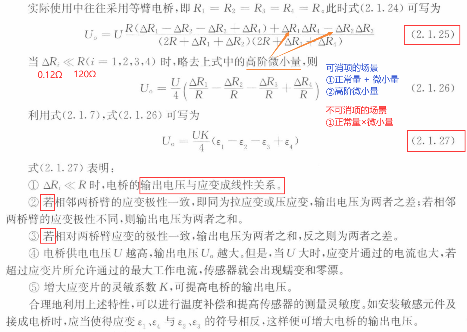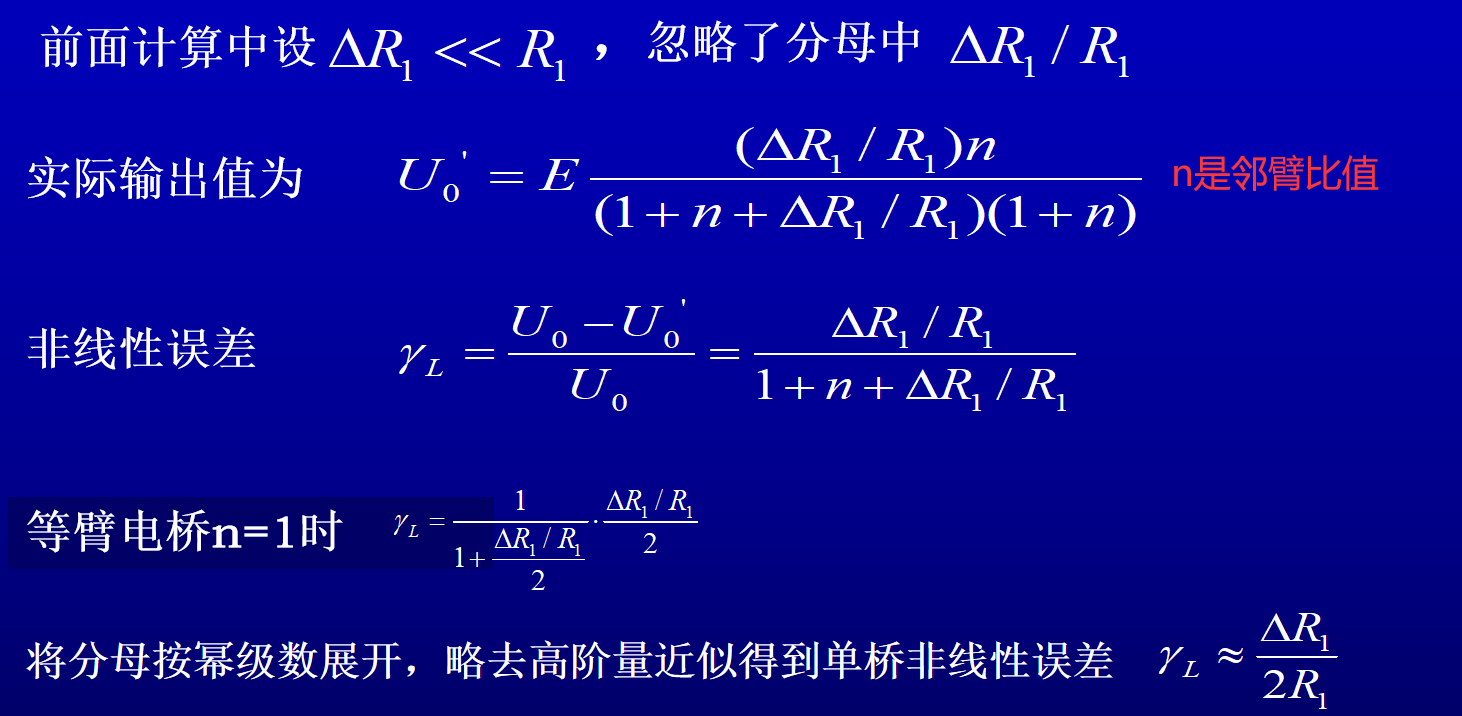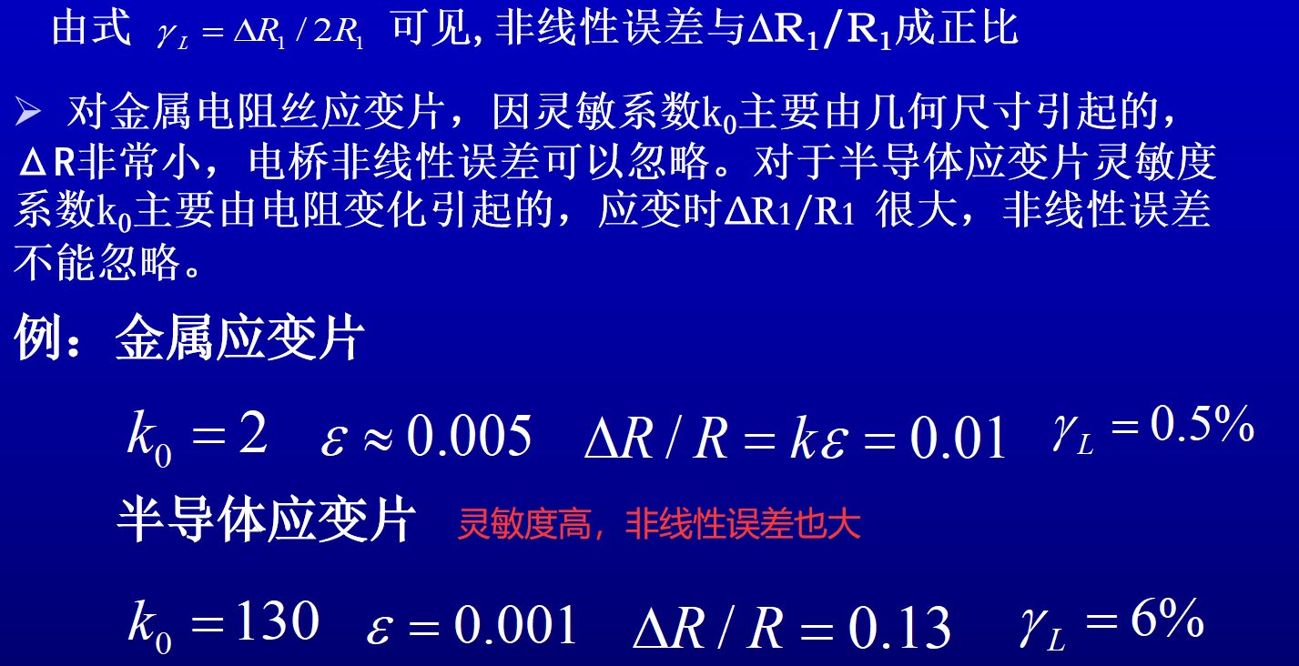 若应变片所承受的应变太大,则上述假设不成立,电桥输出与应变之间不再呈现严格线性,而是具有非线性误差,呈现非线性关系。