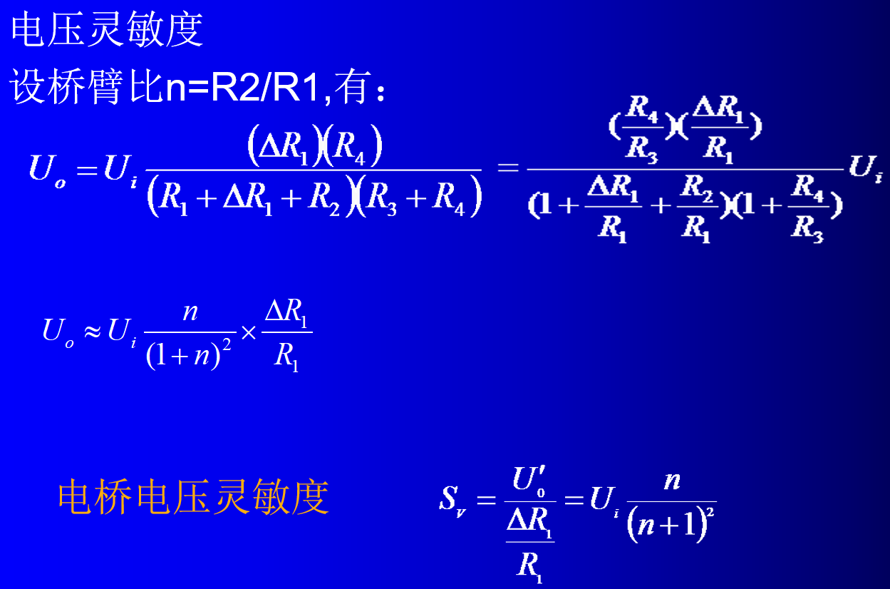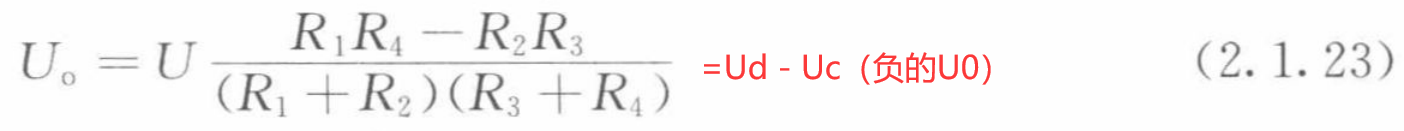 当R1R4=R2R3时,电桥处于平衡状态,输出电压Uo= 0。(对臂积等、邻臂比等)