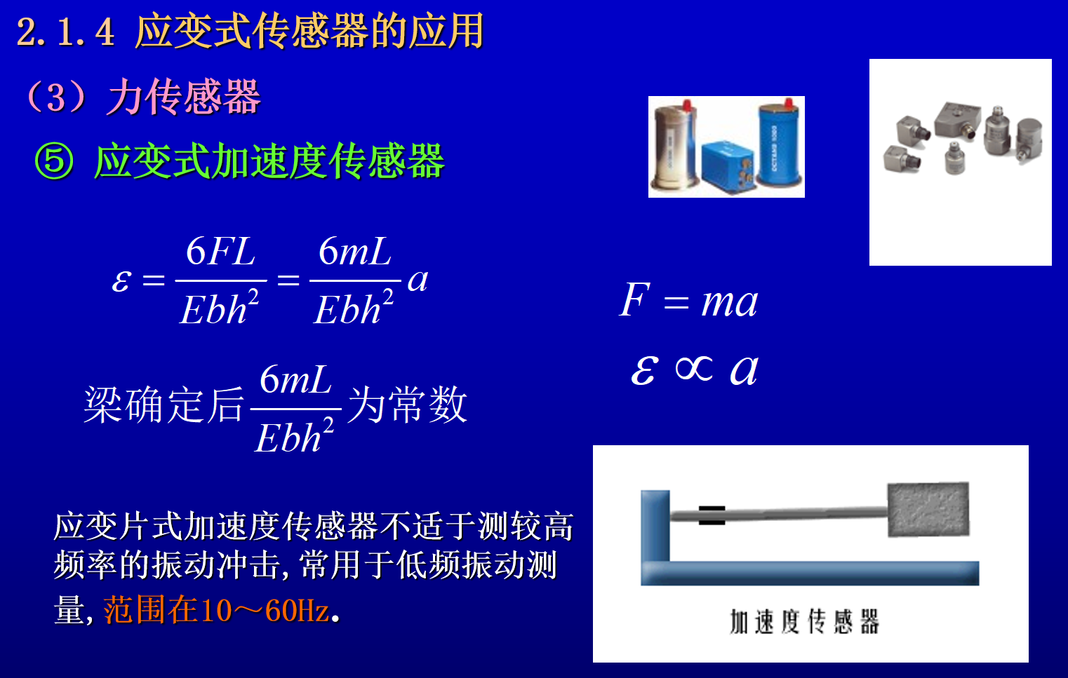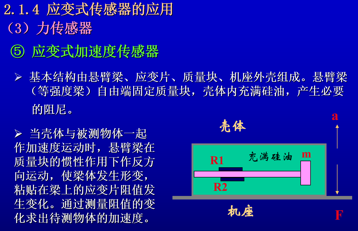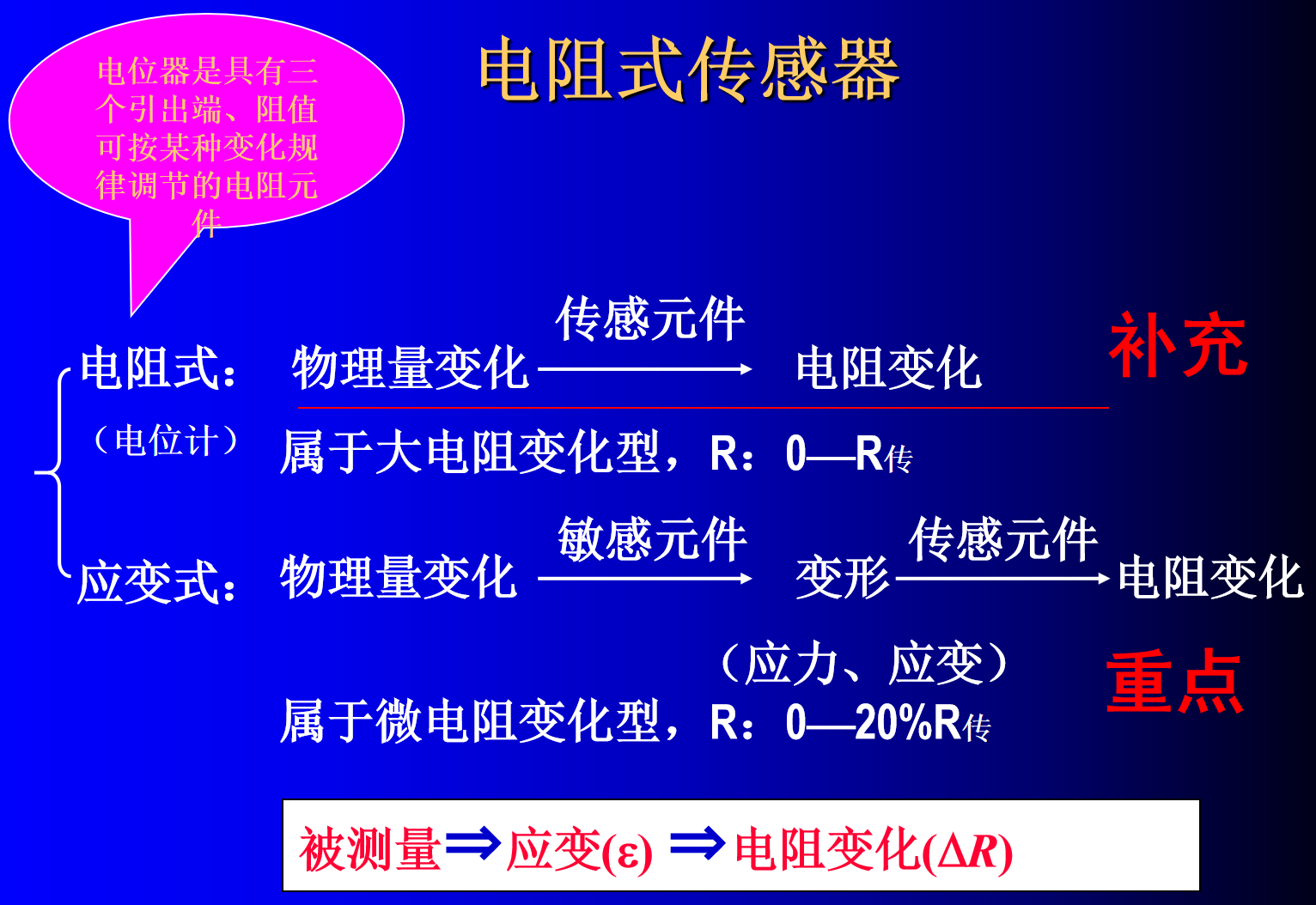 电阻式传感器的应用:可以测量形变、压力、力、位移、加速度和温度等非电量。