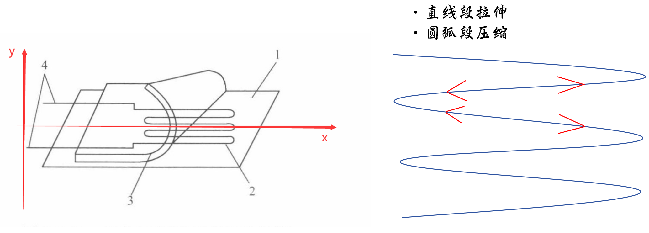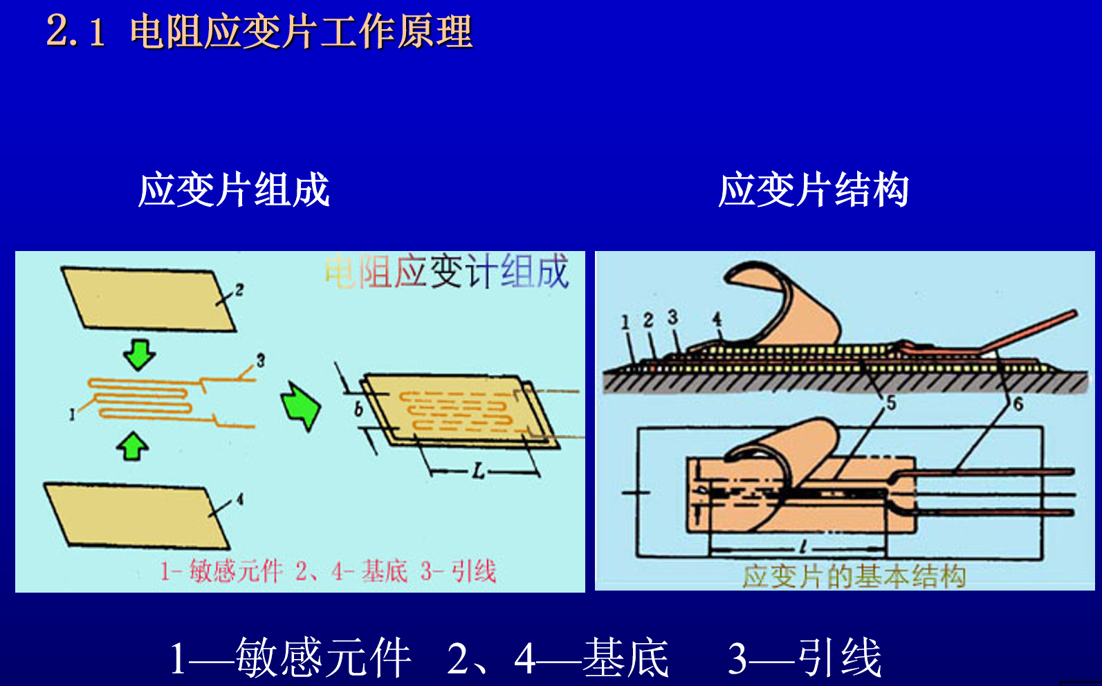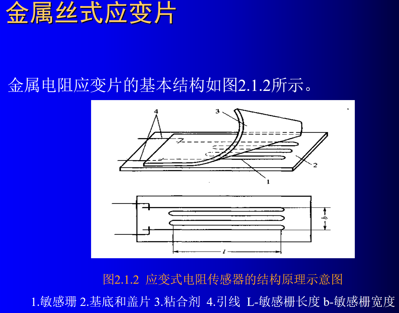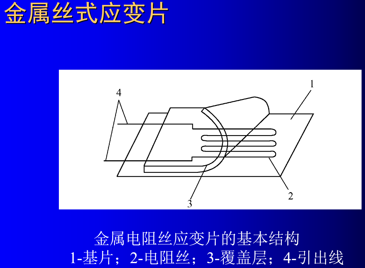 - 将直径约为0.025mm的高电阻率的电阻丝,弯曲成栅状电阻体2,粘贴在绝缘基片1和覆盖层3之间,由引线4与外部电路相连。